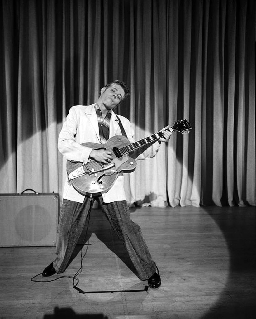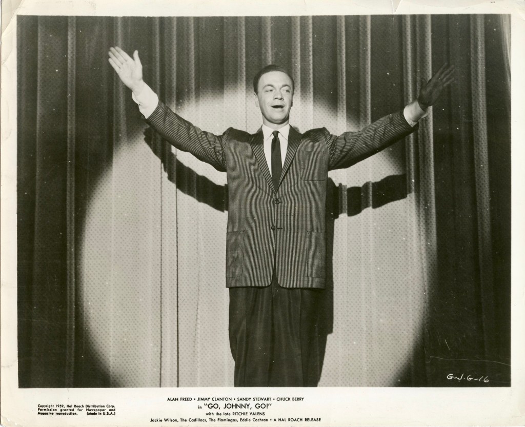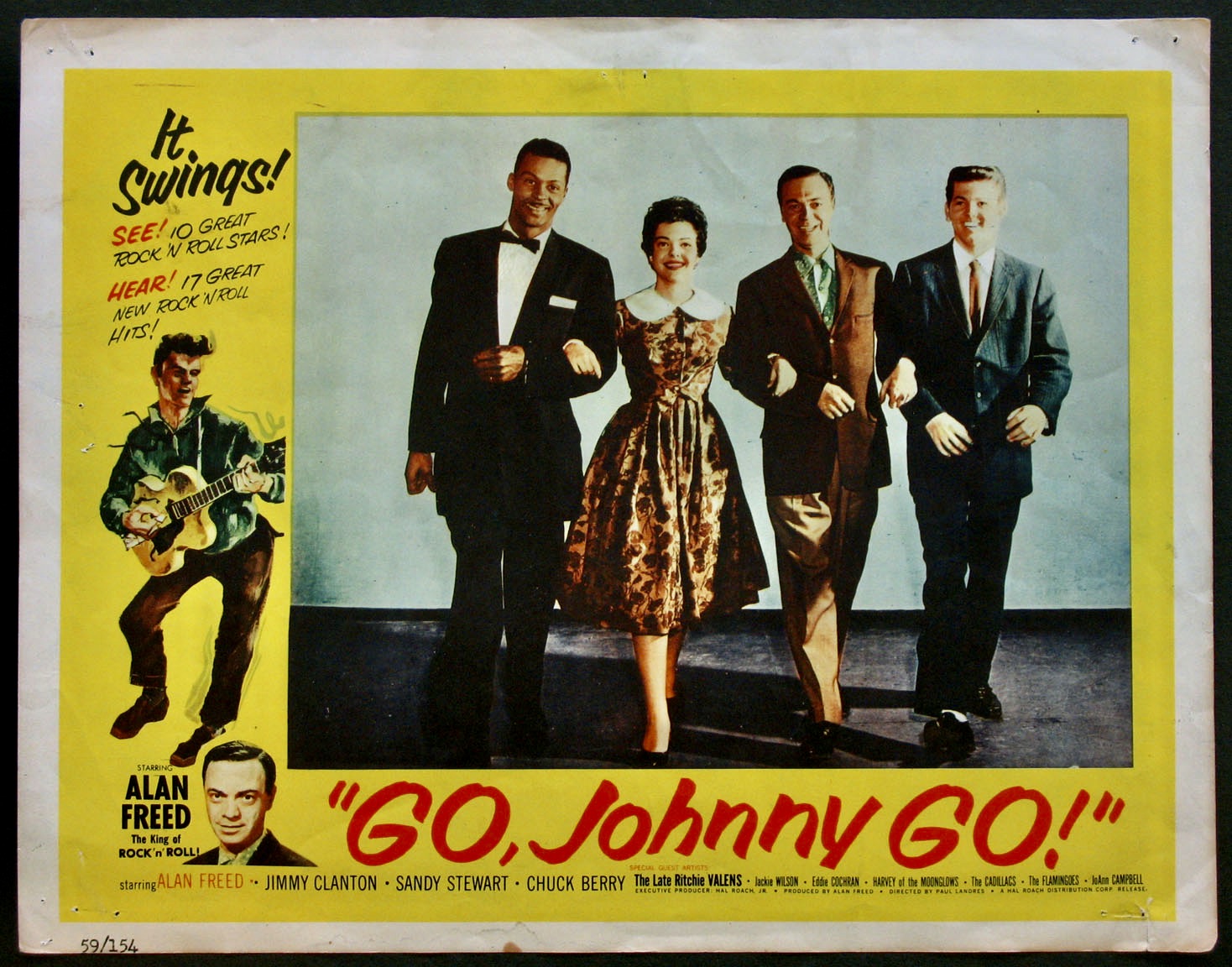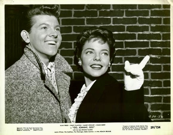 As for the filming of Go, Johnny, Go!, Berry recalled that it was made in five days in Culver City, California at the Hal Roach Studio: “My greatest thrill while there was seeing all the big movie cameras and technical equipment I had only seen in photos. There were lots of people walking around doing nothing, it seemed, but surely on the payroll…The making of Go, Johnny, Go! came around a short tour I was doing through southern California where the movie studios paid for hotel accommodations and food for the cast. I thought that was terrific because I nearly always acquired residence at the cheapest little motel near the airport, which also aided in making the morning flight to the next concert. Sometimes I was invited to a party after the concert and would be out too late to check in anywhere so I would drive on to the local airport and park my Hertz car directly in front of the terminal door entrance, curl up in the back seat, and dream of a king bed with queen covering.”