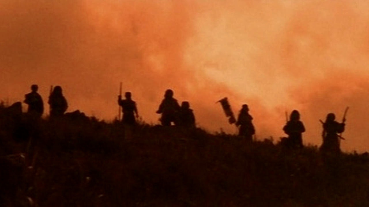 Told in flashback, the origins of the ancestral curse that hangs over the village is depicted in horrific detail as eight surviving members of the Amako clan arrive in the mountain community 400 years earlier after fleeing their enemy, the Morri. At first the villagers are fearful of the eight samurai but after the strangers demonstrate their good intentions by helping to farm the land, they are accepted. The harmony is short lived once Shozaemon (Isao Hashimoto), a village leader, learns that the samurai have a bounty on their heads and he orchestrates a plot to have them murdered at an annual celebration. In the midst of a kabuki show, the eight men are given poisoned sake and attacked with spears, axes and swords before being beheaded. Yoshitaka Amako (Isao Natsuyagi), the head samurai, is the last to die and places a curse on the village and the Shozaemon family line.