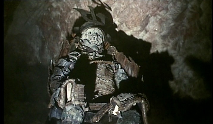 Village of Eight Gravestones does a good job of showing the cultural divide between city and rural life as well as juxtaposing the bucolic setting of the mountain village against the dank, forbidding tunnels and caves that run beneath it. The movie was partially filmed on real locations in the Yamaguchi Prefecture in Japan using Kagekiyo Cave and other caverns as well as studio sets that served as reproductions of actual sites like the luminescent Elf Fire pools. This subterranean setting is particularly creepy throughout the film, especially in the suspenseful final minutes when Tatsuya is pursued in the darkness by some seemingly demonic entity.