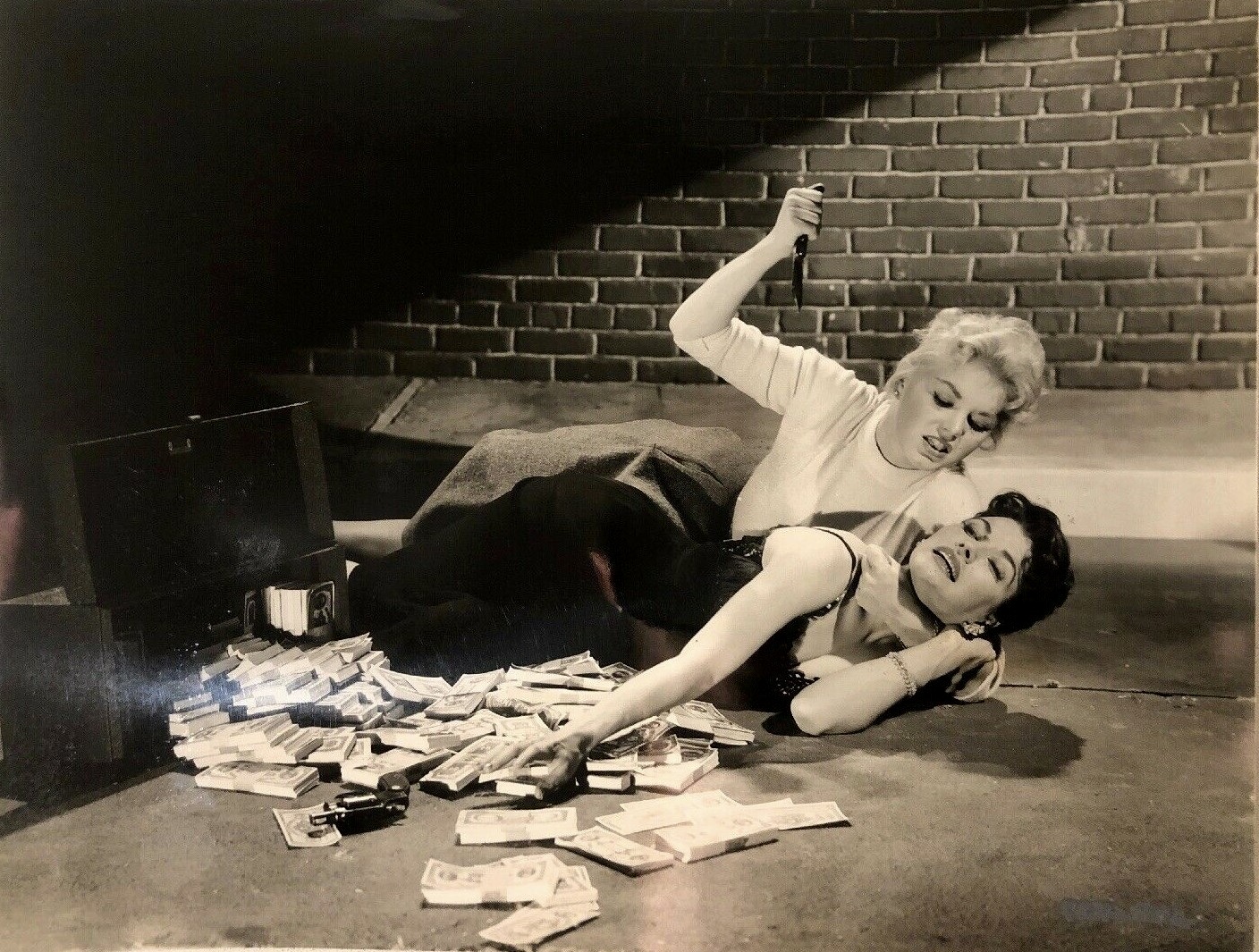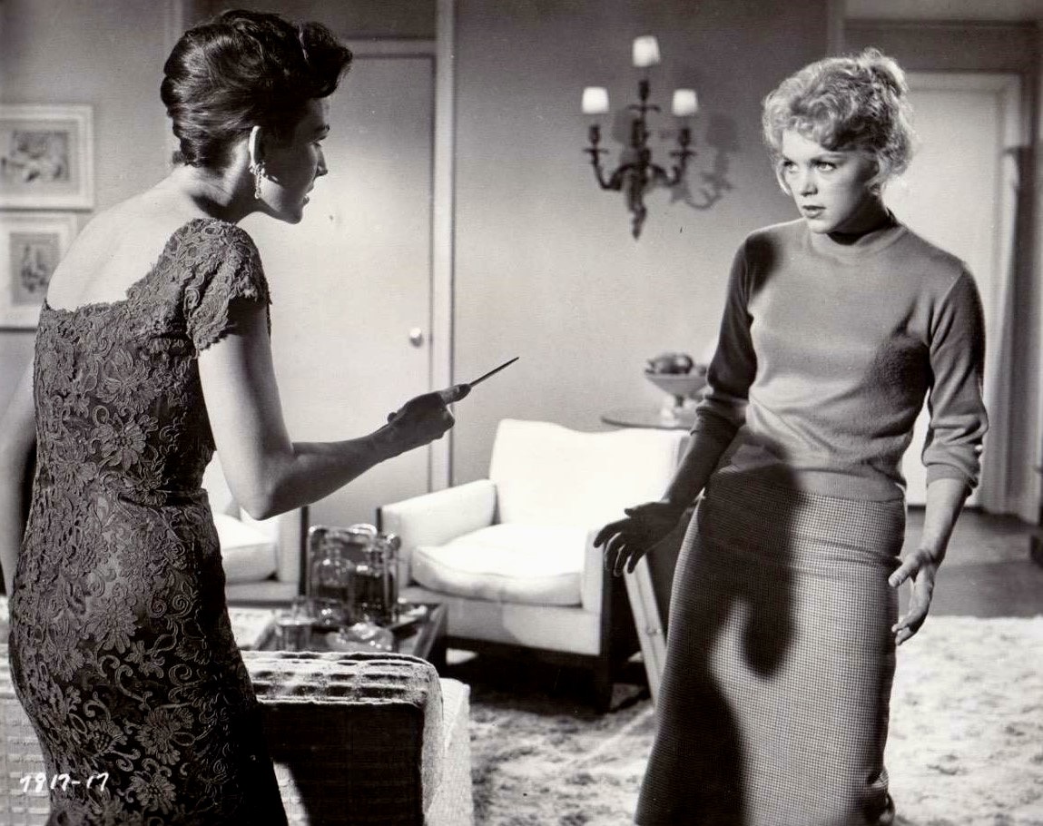 The movie opens with a payroll heist by a masked gang and reveals their true identities during the getaway. The ringleader of this criminal outfit is Vera (Mara Corday), a sexy, hard-as-nails businesswoman who runs a nightclub on the side that spotlights her sister Helen (Barbara Bostock) as the entertainment; Helen sings, does a few dance steps and hustles male customers to buy drinks. Vera’s partners-in-crime are Joyce (Joyce Barker), a mean-as-a-snake blonde vixen who works as a masseuse, Marie (Lita Milan), a French hairdresser who also happens to be a kleptomaniac with a drinking problem, and Agnes (Abby Dalton), the neurotic weak link in the chain who worked at the company that was robbed and provided Vera with the inside information.