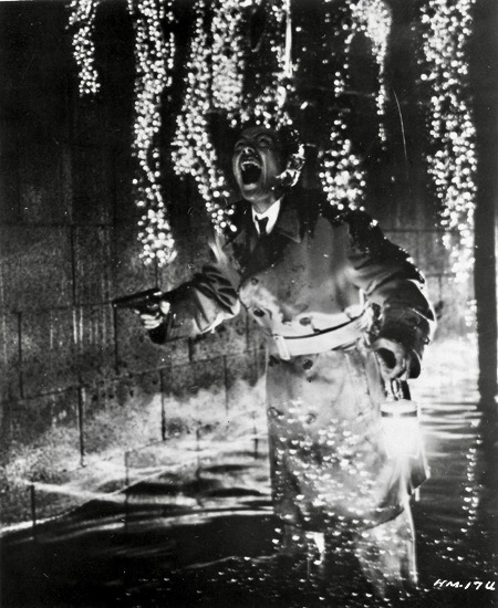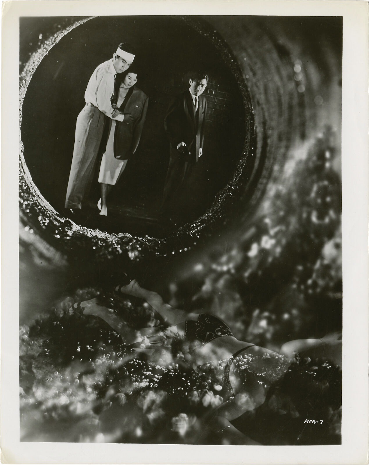 While The H-Man is modest in its exploitation of the gelatinous creatures, the special effects are quite impressive and creepy for its era, especially during the attack sequences when victims are quickly dissolved and consumed. Supposedly, Columbia Pictures, who distributed the film in the U.S., edited some of these sequences due to their shocking nature. According to August Ragone in his book, Eiji Tsuburaya: Master of Monsters, “The ingenious effect was accomplished using life-size latex balloon versions of the victims and filming at high speed while the air ran out of them, creating the illusion of a human being withering away. Other effects included special sets constructed to roll 60 degrees to allow the deadly ooze to threaten the cast members, miniature sequences of a ghost ship, and, for the climax, scale re-creations of the sewers under Tokyo, which are engulfed in flames to combat the H-Men.”