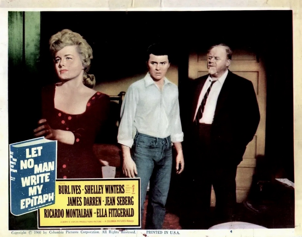 Teenage heartthrob/pop singer James Darren also gives one of his strongest dramatic performances in Let No Man Write My Epitaph – he would go on to co-star in the cult WWII adventure The Guns of Navarone the following year – and Burl Ives is equally accomplished in yet another memorable supporting role. For Jean Seberg, however, Let No Man Write My Epitaph was a personal comedown for her after just returning from France and unanimous critical acclaim for her fresh performance in Jean-Luc Godard’s A bout de soufflé [1960, aka Breathless].
