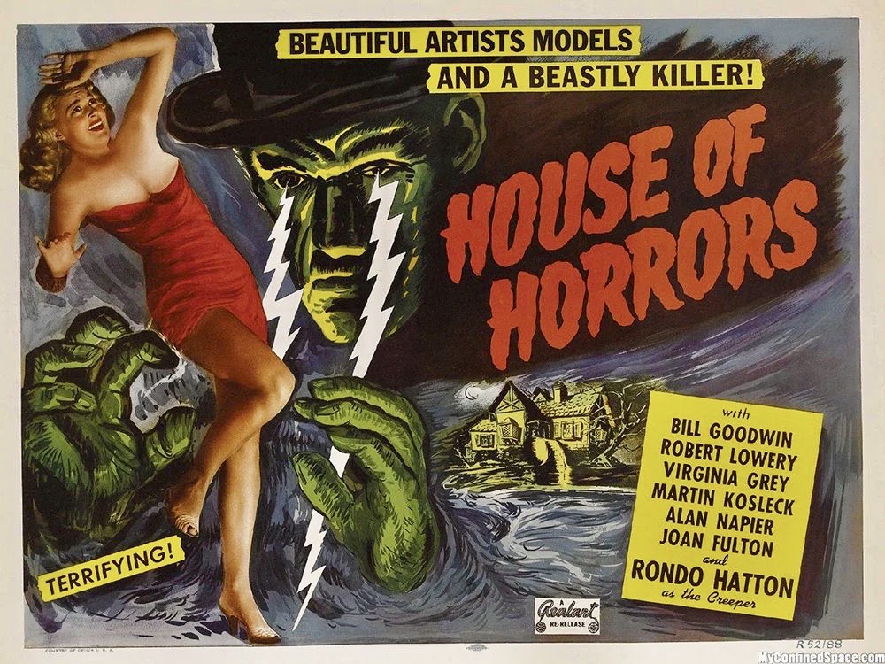 Most fans of classic Hollywood horror films probably remember the first time they saw a Universal horror picture. My first exposure was at age 5 when my parents allowed me to stay up late and watch The Wolf Man (1941) with them. After that, a lot of those early years in Memphis, Tennessee were spent watching “The Late Show” with babysitters while my parents were either attending or giving a cocktail party. Every Saturday night some horror favorite from Universal would air and The Mad Ghoul (1943) was a particularly fond memory. But the one that really stayed with me was House of Horrors (1946) featuring Rondo Hatton as “The Creeper.”