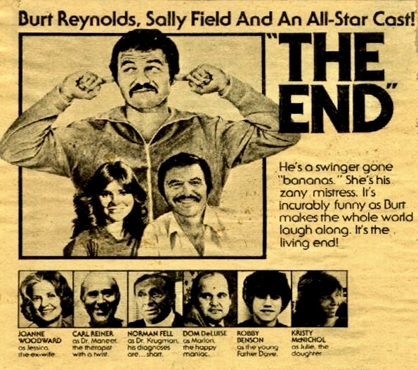 By 1978 Burt Reynolds was approaching the peak of his popularity which would begin to taper off in the mid-eighties as he approached the age of 50. He had just completed two huge box office hits, Smokey and the Bandit and Semi-Tough (both 1977) and was in a position to choose and develop any project he fancied. But instead of rushing into a sequel to Smokey and the Bandit or some other big budget vehicle that exploited his good ole boy blend of machismo, charm and sex appeal, Reynolds chose to make a risky, offbeat black comedy about a man dying of a terminal condition who contemplates suicide as a solution to a slow, agonizing death. In addition, the popular leading man would direct and star in it and cast his girlfriend at the time Sally Field in a prominent role. Released as The End in 1978, the film was not what moviegoers or critics expected from Reynolds or even wanted.