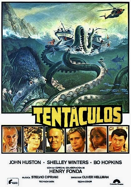 While almost everyone on the planet who has seen Tentacles and commented it on it has trashed it as boring, stupid and for masochistic completists only, I found it to be an oddly appealing train wreck of a movie, mostly due to the participation of John Huston as the world’s oldest investigative reporter, Shelley Winters as his divorced, single mom sister! and Henry Fonda as the grumpy head of a super corporation called Trojan, Inc. Fonda’s company is constructing a massive underwater tunnel that is apparently stirring up the denizens of the deep – in particular, a rarely glimpsed carnivorous octopus. Whenever Huston, Winters and Fonda are on the screen, I am immediately pulled out of the movie and find myself considering them, not as the characters they are playing, but the Hollywood legends they once were.