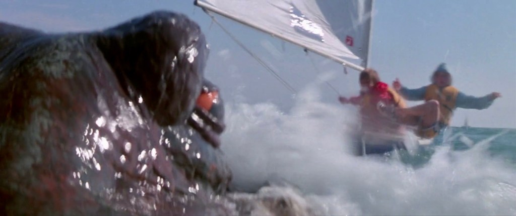 Hopkins’ character already seems slightly cuckoo when he’s first introduced and he only gets kookier as the movie races toward a peculiar anti-climax with Bo sailing off into the sunset for Africa with his hunky assistant trainer. His big scene is not the one when he first learns of his wife’s horrible death and Huston comments, “I’ve read that the suckers on a tentacle are like claws on a tiger,” oblivious to the tactlessness of his remark. Instead, Bo’s big moment is his soliloquy to the killer whales which comes off like a major mental breakdown and not the heroic pep talk it’s meant to be: “I’ve lost a loved one. I need your help more now than ever. I remember the time I was training ya, people used to call ya killers. They used to call me that on the streets. Doesn’t mean nuthin’. You have more love in your heart, more affection than any human being I ever met. [That doesn’t say much about his wife] But now I can’t ask anybody else so I’m asking you to help me kill this octopus. I hope you understand that. I know I’m in your environment. I don’t want it this way. But if I release ya and you go away, I want you to know that I understand. Alright, enough said. I gotta go now. If you feel anything, you talk to me. Make some noises. I know people think we’re crazy. Maybe we are…maybe we are.”