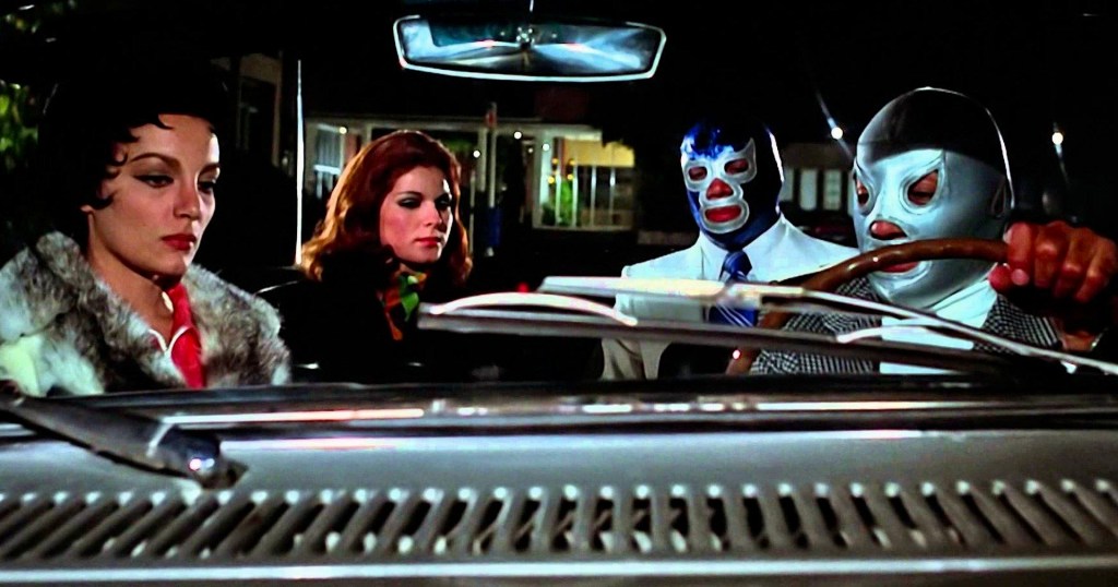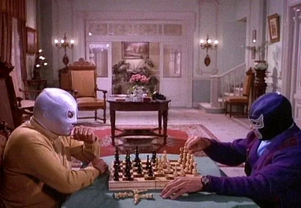 In terms of action, Santo & Blue Demon vs. Dracula & the Wolf Man doesn’t disappoint and there’s an unforgettable scene where our masked heroes are rescued from being unmasked (a situation that almost occurs in every Santo movie) by a gorgeous woman driving a forklift. Still, it’s the quieter scenes that are often the nuttiest. What’s more bizarre than seeing Santo and Blue Demon in their full regalia enjoying a quiet, relaxing game of chess at home?