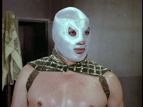 Santo and Blue Demon eventually get girlfriends, though dating guys who wear masks (and never remove them) can’t be easy. The scene where Santo, Blue Demon and their respective dates have dinner at a high-class restaurant is an instant classic. In the background, the other diners appear to be oblivious to the freaks at table 5 who may as well be burn victims at a posh charity dinner. Suddenly the whole brain transplant subplot seems unimportant when you can actually see Santo and Blue Demon dining in public. It all ends up in the ring of course – as Dr. Frankenstein straps a mask on Golem and shoves him into the ring to fight Santo. The climax is disappointing, given that Dr. Frankenstein (played by Russek with sneering conviction) ends up being a poor strategist with his high-tech lair, expensive work force, and numerous technical trinkets.