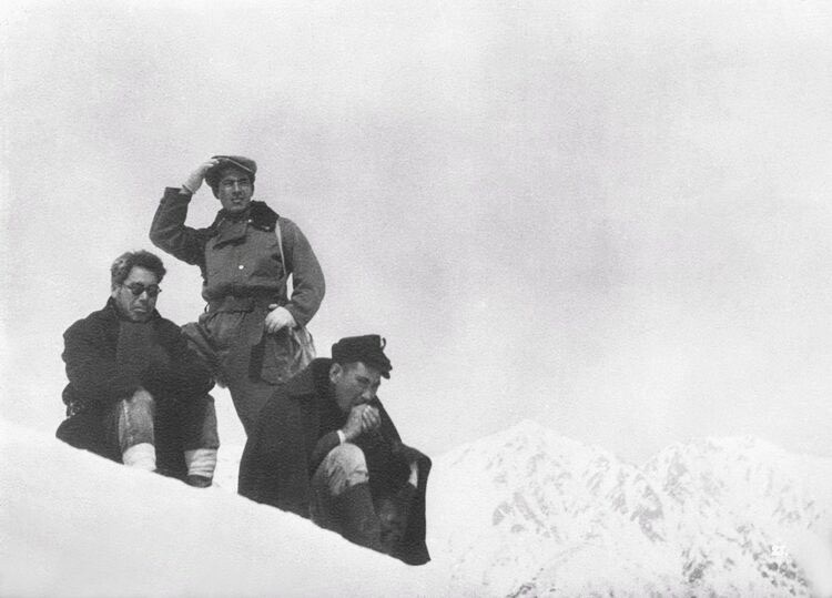 As the surly Eijima, Mifune exudes the sex appeal and raw magnetism of a young Brando and it’s easy to see how he quickly became a star. For a first film, it’s an impressive debut and Akira Kurosawa, who co-wrote the screenplay with director Senkichi Taniguchi, realized his potential and cast him in his next feature Drunken Angel (1948) as a violent gangster suffering from tuberculosis. In the title role was Takashi Shimura, who had already made several films with Kurosawa and would go on to even greater critical acclaim in such directorial masterpieces as Ikiru (1952) and The Seven Samurai (1954). Snow Trail is like a warm up role for Mifune’s hoodlum from the slums in Drunken Angel and he is as vicious and threatening as Humphrey Bogart’s Duke Mantee in The Petrified Forest (1936). When Honda advises him on rope support for their climb, he angrily responds, “I’m on a leash? Do you own me?” Yet, Honda keeps his cool and later explains to the more sensible Nojiro, “Mountaineers have a code. No matter what, we don’t cut the rope. The rope ties one human life to another and is not to be touched.”
