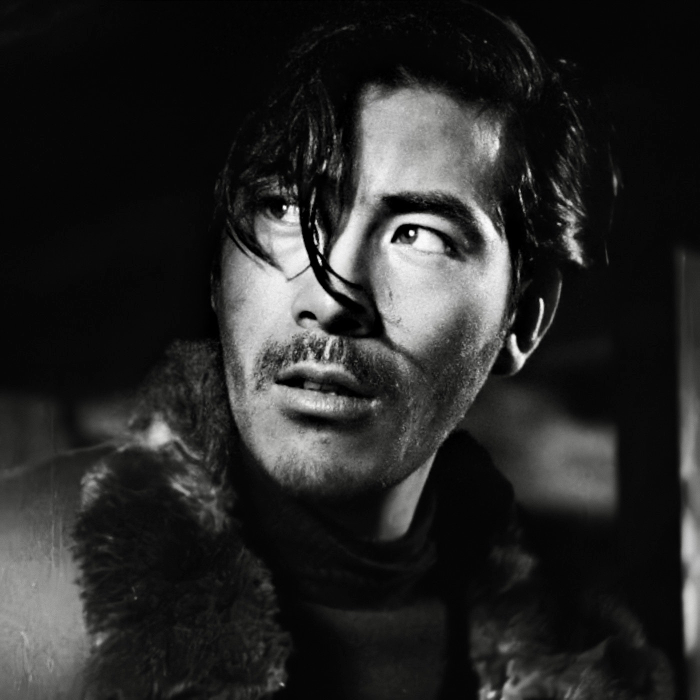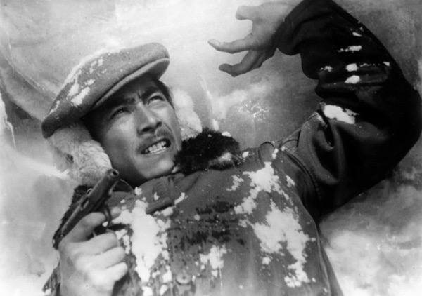 The opening credits of the film featuring a police manhunt for the runaway criminals looks like a typical crime drama in the Warners Bros. style but Snow Trail quickly transitions into an intimate man vs. nature drama as well as a tale of redemption for one of the robbers known as Nojiro (Takashi Shimura). He is the ringleader of the group that includes Eijima (Toshiro Mifune), a violent and impulsive hothead, and Takasugi (Yoshio Kosugi), an older and not so bright accomplice. At first Nojiro appears to be quietly menacing in his dark sunglasses while displaying a gloved hand that is missing two fingers but, as the film progresses, he exhibits more resignation and regret over his profession than his feral companions.