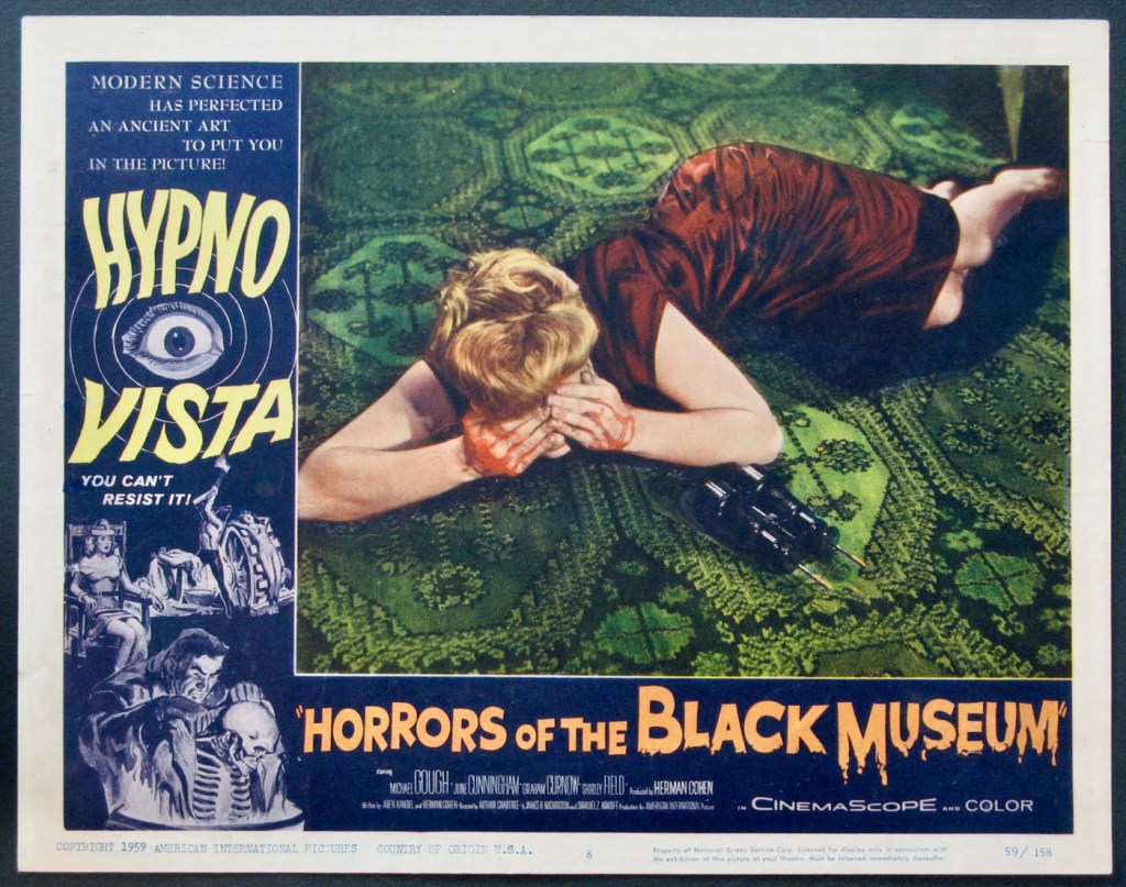 Circus of Horrors also disturbed my brother too but he was old enough to laugh it off as junk and would occasionally tease me by creeping up behind and humming “Look for a Star” with this spooky look on his face. This film left its mark on me but of course I had to see more: Horrors of the Black Museum (1959) was another of the early “British nasties” which were condemned by British censors along with Peeping Tom and Circus of Horrors. The movie, directed by Arthur Crabtree (Fiend Without a Face) and starring Michael Gough as a homicidal crime writer, opens with a woman receiving a gift of binoculars from a secret admirer. When she looks through them while adjusting the focus, two sharp spikes are triggered and piece her eyes as she collapses in bloody agony. It is a truly shocking sequence but more gruesome deaths would follow. The fact that it was paired on a double bill with The Headless Ghost (1959), an innocuous horror comedy about teenagers in a haunted house, seemed like a sick joke on the audience by the distributor.