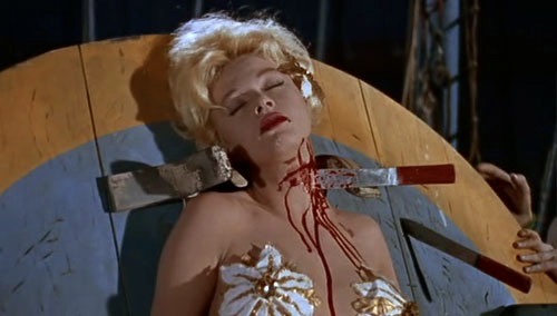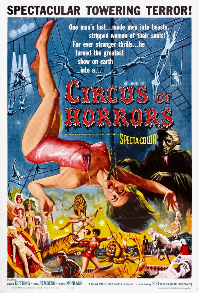 While both Something of Value and Last Train From Gun Hill were upsetting to me, they paled in comparison to the film I saw the next summer at the Wink Theatre again in Dalton, this time accompanied by my older brother. It was Circus of Horrors (1960) and the sleazy, sordid atmosphere of the film seemed to permeate everything in the theatre. The story of a plastic surgeon (Anton Diffring) on the run after a botched operation, the movie follows the doctor to a traveling circus which he eventually inherits turning a previously disfigured girl into one of its stars. In fact, female disfigurement is one of the movie’s recurring motifs with numerous closeups of hideously distorted faces (the opening sequence for one is truly nightmarish) and occasionally risque shots of the disfigured women in various states of undress. Then there are the murders.