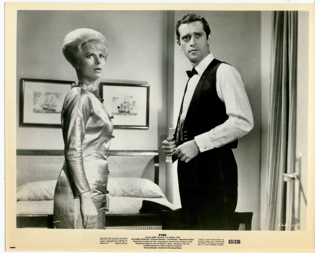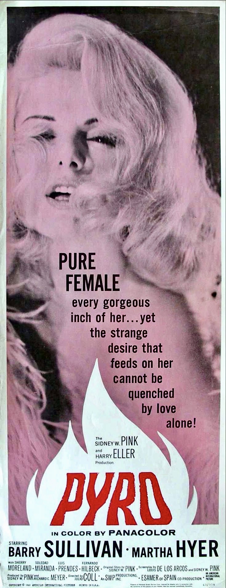 Sidney W. Pink, who came up with the story idea for Pyro (the screenplay is by Luis de los Arcos), stated in an interview that the film was his best work and his favorite, which seems a reasonable assumption when you look at his filmography and see other Pink productions with titles like I Was a Burlesque Queen (1953), A Witch Without a Broom (1967) and The Man from O.R.G.Y. (1970). Nevertheless, Pink deserves a footnote in the history of cinema for launching the 3-D craze of the early fifties (He was the associate producer on 1953’s Bwana Devil, directed by Arch Oboler). He also claimed he discovered Dustin Hoffman in an off-Broadway play and cast him the caper comedy Madigan’s Millions. The film was shot in 1966 but not released until 1968 after The Graduate (1967) became a critical and box office success.