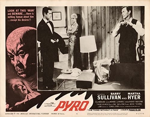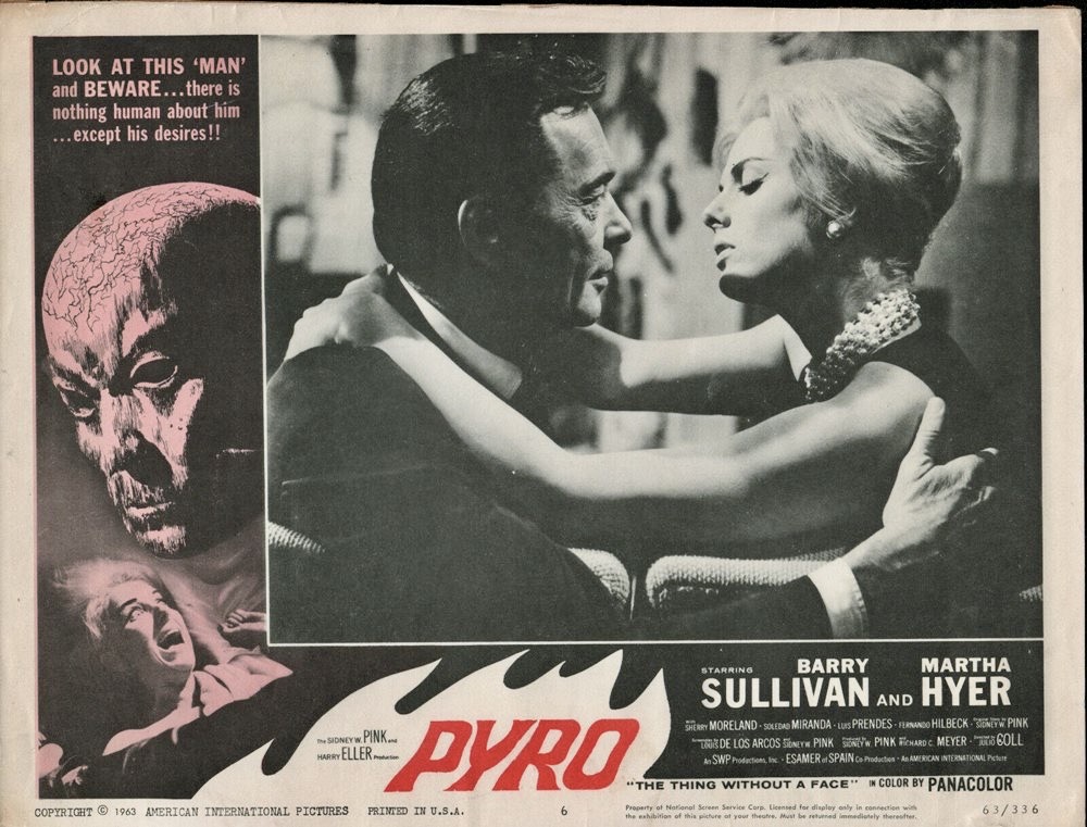 The horror aspect of Pyro is reminiscent of 1933’s Mystery of the Wax Museum and 1953’s House of Wax in which the chief villains have become insane after surviving a fire and are now hiding behind lifelike masks. Vance ends up fashioning a mask that looks just like Barry Sullivan with blonde hair and his disguise includes two mechanical hands since he lost his in the fire. The marketing department at American International Pictures, which picked Pyro up for distribution in the U.S., promoted Sullivan’s creepy scarred face in one promotional campaign, which is a huge spoiler. The other poster concept exploited the film’s sexual angle, equating lust with pyromania.