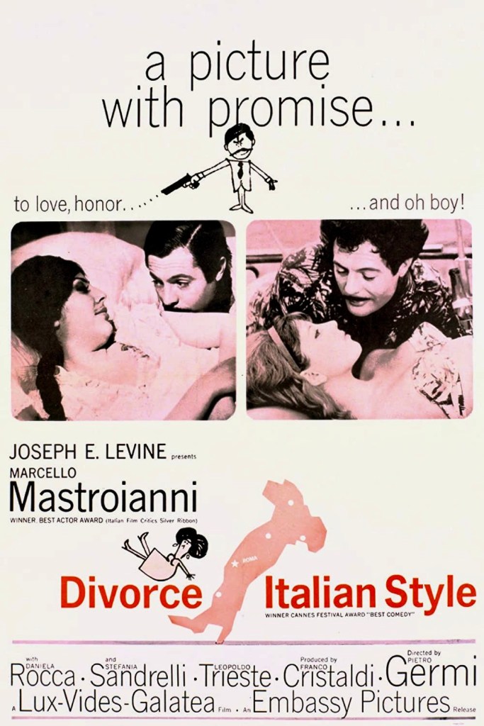 One doesn’t usually expect a film about infidelity, divorce and murder to be a comedy but that’s one reason Divorzio all’italiana (English title: Divorce, Italian Style, 1961) directed by Pietro Germi, became an unexpected international hit. A caustic satire about the Italian male – or more specifically, Sicily’s male dominated culture – the film also poked fun at Italy’s hypocritical judicial system which can forgive crimes of passion but not legally recognize divorce as a solution for failed marriages. Another factor in the movie’s success was Marcello Mastroianni’s beautifully rendered portrayal of the preening, self-absorbed protagonist, a performance which not only won him an Oscar nomination for Best Actor (the first time in Academy Award history that the lead in a foreign language film received that honor) but still ranks as one of the actor’s key films, following closely on the heels of Fellini’s La Dolce Vita (1960) and Antonioni’s La Notte (1961).