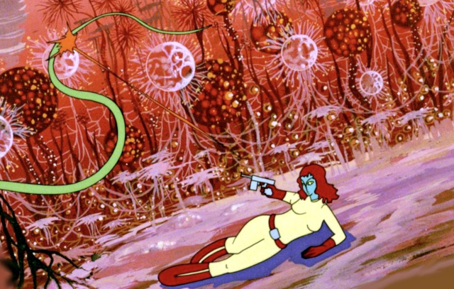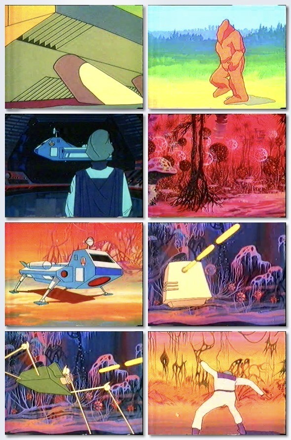 Alma is completely dazzled by the look and design of the super brain and goes into a rapturous flight-of-fancy dance which is just one of many strange but delightful sequences in the film. What Alma and the rest of the crew don’t realize is that the super brain is equally smitten with Alma and decides it will possess her at all costs. The A.I. creation goes awry and produces a robot army to carry out its mission but a battle between the Delta team and the super brain ends with the aggressor disappearing into the cosmos. It is only when Alma and Tin attempt to return to their own planet that the super brain re-emerges from hiding and forces the duo to crash land on Acora, a swampy, primeval world inhabited by bizarre flora, fauna and shape-shifting creatures. Can the original Delta team rescue Alma and Tin before they fall prey to the dangers of Acora or will they be re-captured by the super brain?