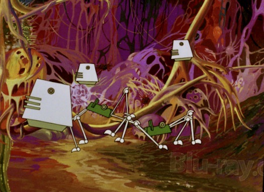 Alma is completely dazzled by the look and design of the super brain and goes into a rapturous flight-of-fancy dance which is just one of many strange but delightful sequences in the film. What Alma and the rest of the crew don’t realize is that the super brain is equally smitten with Alma and decides it will possess her at all costs. The A.I. creation goes awry and produces a robot army to carry out its mission but a battle between the Delta team and the super brain ends with the aggressor disappearing into the cosmos. It is only when Alma and Tin attempt to return to their own planet that the super brain re-emerges from hiding and forces the duo to crash land on Acora, a swampy, primeval world inhabited by bizarre flora, fauna and shape-shifting creatures. Can the original Delta team rescue Alma and Tin before they fall prey to the dangers of Acora or will they be re-captured by the super brain?