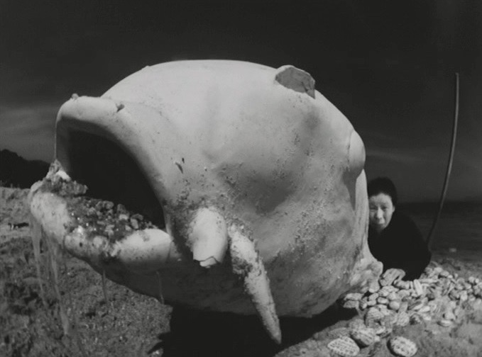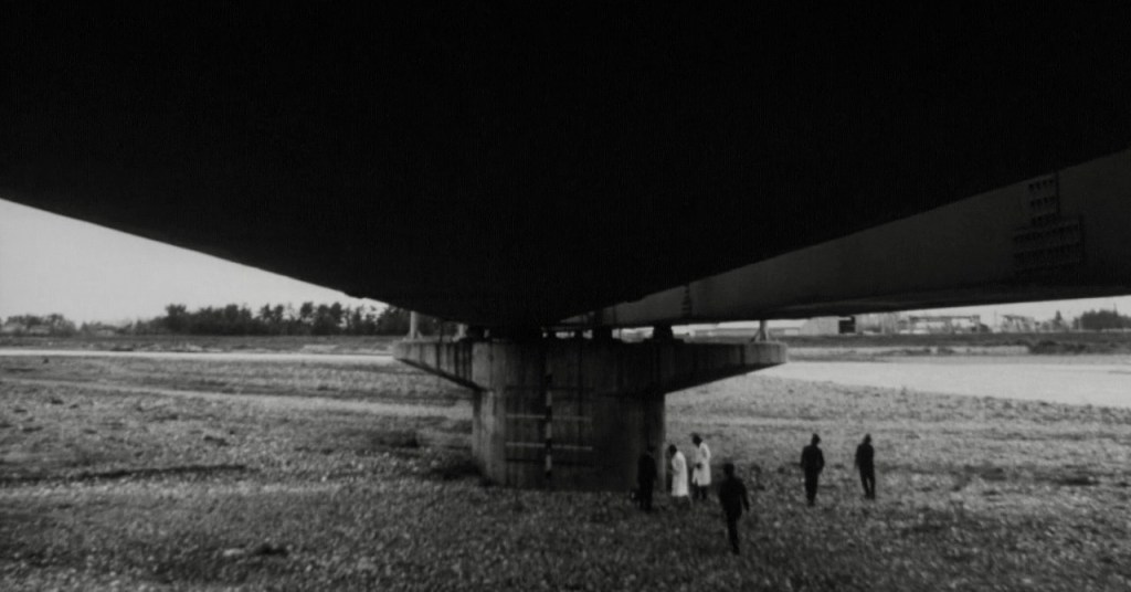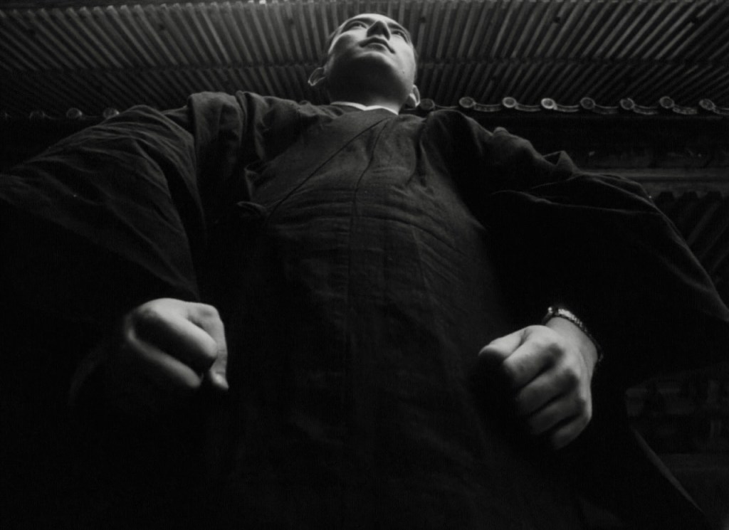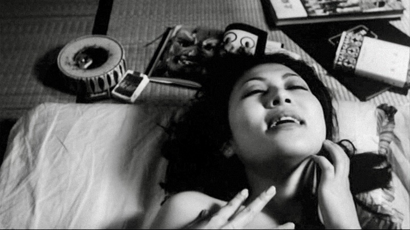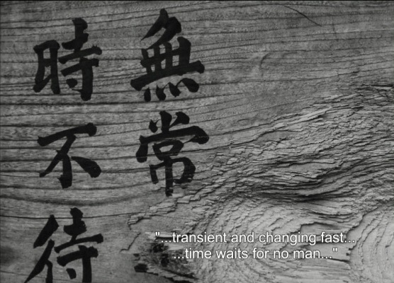 Whatever you make of the film, the black and white cinematography (which required the services of three cameramen, Yuzo Onagaki, Masao Nakabori and Kazumi Oneda), is consistently stunning and always in motion, whether it is exploring the façade of a Buddhist statue or observing the faces of characters spying on each other (voyeurism is a key theme throughout the movie). Occasionally Jissoji will use a Buddhist saying as a transition device between scenes, rendered as on-screen text, such as “transient and changing…time waits for no man.” In fact, the film’s Japanese title Mujo is a Buddhist term that means life is fleeting and ethereal.