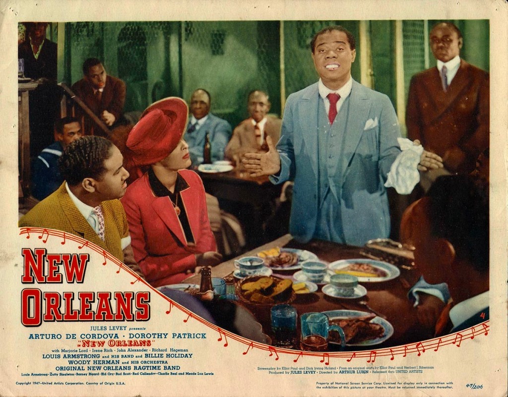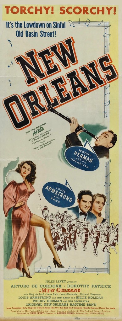 How’s this for a dynamite screen team – Billie Holiday and Louis Armstrong? They appear together and separately in New Orleans (1947), a fictitious love story set during the end of the Golden Age of jazz circa 1917 – the year Storyville ceased to be the Crescent City’s hot spot.