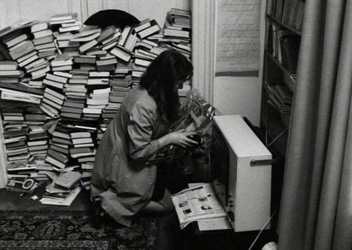 Part social mockery, part agitprop, Kluge’s film takes a freewheeling, semi-documentary like approach to his subject in an attempt to break away from conventional narrative forms and create something more organic which activates “the spectator’s own capacity to make connections between vastly disparate images,” according to Michelle Langford in her essay for Senses of Cinema. How does he accomplish this? Through jump cuts, voice over narration, utilizing film clips, illustrations and drawings from books with literary and philosophical quotes, plus mixing professional with nonprofessional actors and employing cinema verite-like improvisation. Kluge also uses diegetic music and sounds and freely samples from an eclectic range of songs that includes an aria from Bizet’s Carmen and the pop song “Taka Takata,” sung by Joe Dassin.