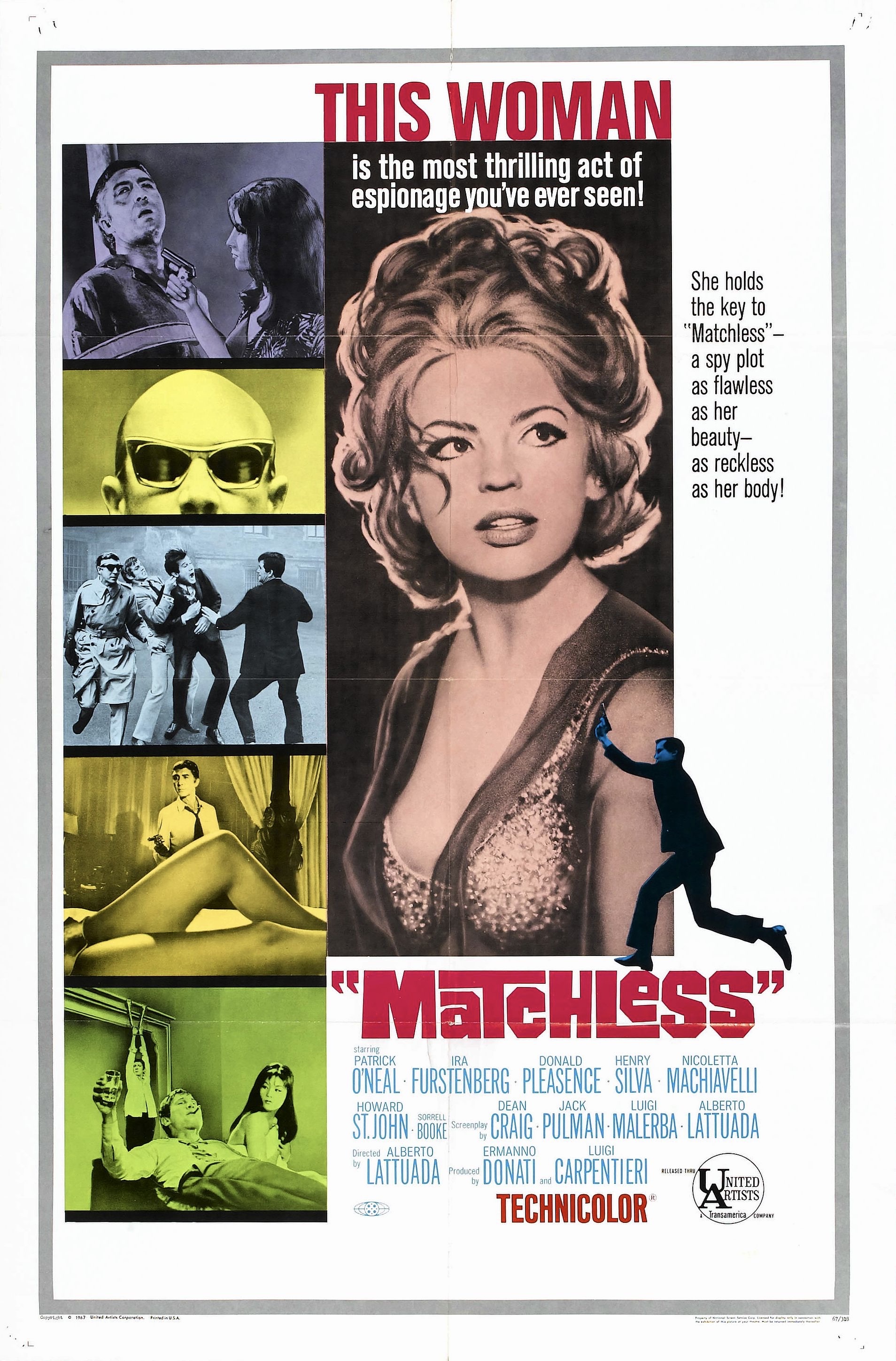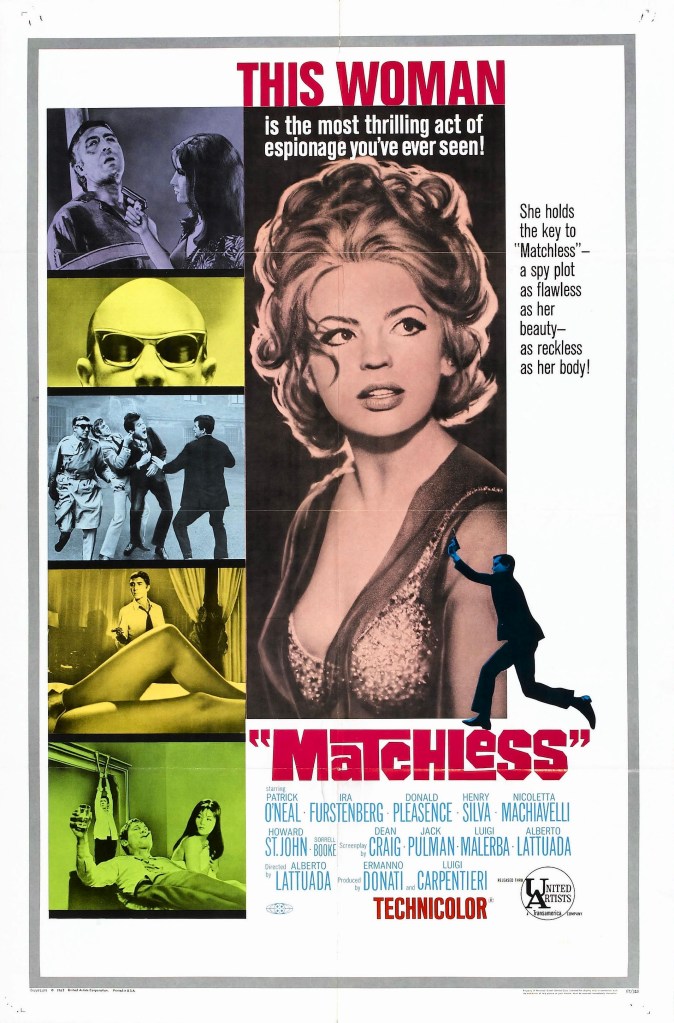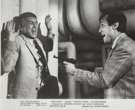 In the title role, Patrick O’Neal is not really a professional spy. He’s actually a reporter from The New York Tribune who signs his columns with the byline of “Matchless.” While on assignment in China, he is captured and tortured in a secret prison by Chinese agents who think he possesses top-secret information about a lethal chemical substance. He miraculously escapes a firing squad only to end up imprisoned by American military intelligence who are after the same thing. Considering his limited options, Liston agrees to masquerade as a secret agent for the U.S., teaming up with fellow spy Arabella (Ira von Furstenberg). Their mission leads them to the lair of international criminal Andreanu (Donald Pleasence) who keeps samples of the deadly chemical in a Munich bank. Complicating their assignment are Hank Norris (Henry Silva) and Tipsy (Nicoletta Machiavelli), rival spies for the Chinese.