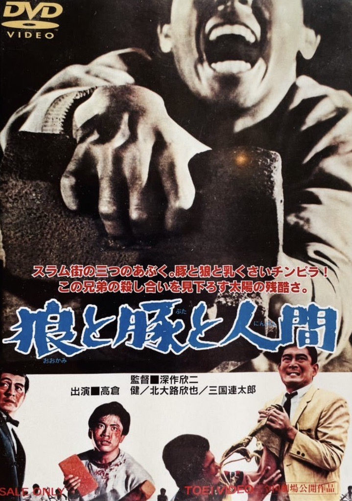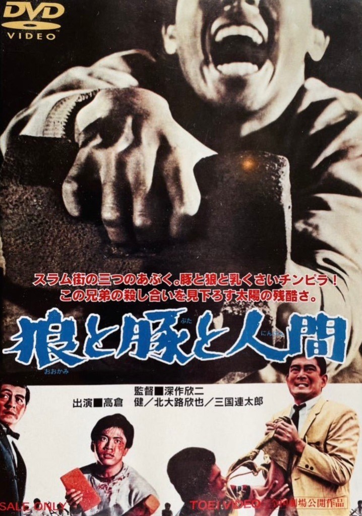 Among the many post-WW2 Japanese filmmakers who emerged in the 1960s and hit their stride in the seventies, Kinji Fukasaku was one of the most prominent and critically acclaimed directors in his own country but didn’t start to acquire a growing fan base in the U.S. until after 2000 when some of his masterworks began to appear on DVD such as the yakuza epic Battles Without Honor and Humanity aka The Yakuza Papers (1973), which launched a five-film franchise, and Battle Royale (2000), a controversial futuristic fable about institutionalized violence against problem teenagers. Over the years, Fukasaku has dabbled in numerous film genres from historical drama (Under the Flag of the Rising Sun, 1972) to sci-fi (Message from Space, 1978) and comedy (Fall Guy, 1982), but he is best known from his crime dramas, especially those which popularized the jitsuroku eiga genre. His documentary-like dramatizations based on real crimes often depicted yakuza figures as ruthless men operating without “honor and humanity” (in the title words of his breakthrough film). Even prior to his trend-setting crime thrillers of the mid-seventies, Fukasaku was turning out edgy, innovative work and Okami to Buta to Ningen (English title: Wolves, Pigs and Men) from 1964 is an explosive, nihilistic tale which qualifies as a rough-hewn, early masterpiece.