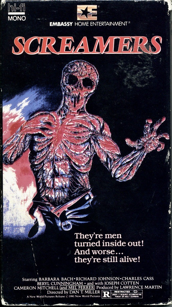 Below are some samples from Portable Grindhouse while others are some of my favorite examples of this now lost VHS art form which was predominately male oriented, a telling example of the times and the industry. Some of these images will conjure up now defunct distributors while others may remind you that it was not uncommon for some titles to enjoy an entirely new life on VHS under a new name – and, in the case of international films, often re-dubbed and re-edited into something entirely different than its original version such as Screamers (1978), an Italian horror/fantasy starring Barbara Bach and Joseph Cotton, which also exists under the titles Isle of the Fisherman, Island of Mutations and Something Waits in the Dark.