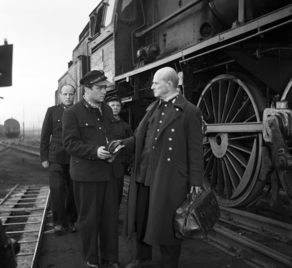 Man on the Tracks was Munk’s first feature length movie after working primarily in the documentary genre where he turned out short films like the 1953 offering A Railwayman’s Word. Although the film casts a critical eye toward socialist party politics circa 1950 (the year the story takes place) and contains some satiric observations about Stalin’s five-year-plan that Poland was attempting to enforce, the film is much more of an engrossing character study than a political drama. More importantly, Man on the Tracks is a realistic look at the lives of railroad men, their rank and job responsibilities and how they interact with each other in the wake of Stalin’s death. At the center of it is Orzechowski (Kazimierz Opalinski), a forty-year railroad veteran whose perfectionism and high standards for his team make him an intimidating presence among the younger workers.