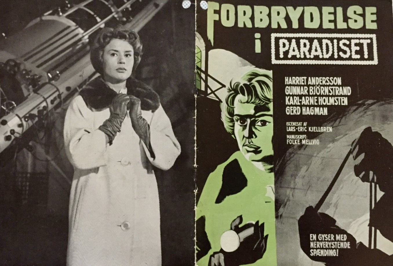 Swedish actress Harriet Andersson is best known for her many film collaborations with director Ingmar Bergman but, even after she became a celebrated star in the mid-fifties with her breakout role in Bergman’s Summer with Monica (1953) and the award-winning Smiles of a Summer Night (1955), she continued to appear in a wide variety of films and not just art-house fare. She could play anything from sexy sirens to fiercely independent, working class women to romantic heroines and one of her more entertaining efforts is her performance as Eva Malmborg, a fledgling reporter who helps solve a famous robbery/murder in the 1959 genre thriller Brott I Paradiset (English title: Crime in Paradise), directed by Lars-Eric Kjellgren.