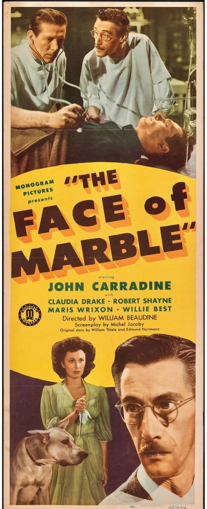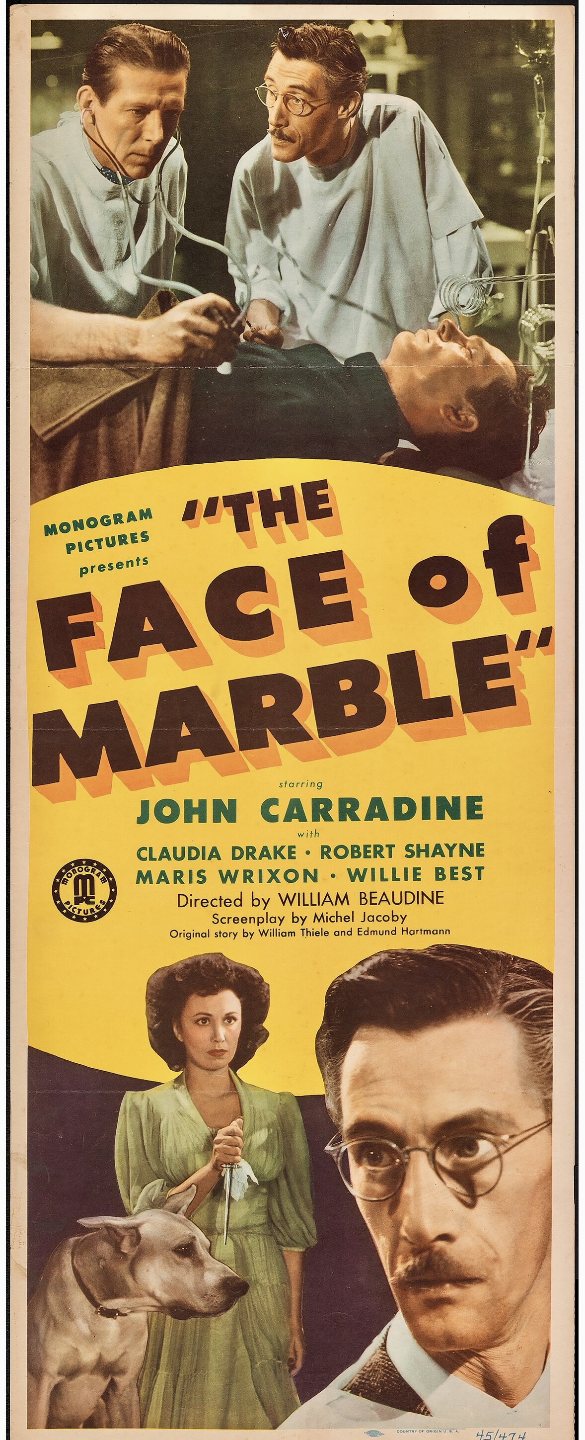 It’s not likely that a Poverty Row horror film like The Face of Marble (1946) will ever end up on anyone’s top ten list – unless the category is guilty pleasures – but that’s what distinguishes a movie like this from a title on the AFI approved list of great American classics. A cult movie rarely conforms to conventional standards of what’s good and what’s bad and that’s why The Face of Marble could be a more entertaining and challenging viewing experience than say, Ingmar Bergman’s Winter Light (1963). For one thing, you need a scorecard to keep track of the anything-goes-plot which ties together failed scientific experiments, reanimated corpses, a blood-drinking ghost dog that can walk through walls, a voodoo-practicing housekeeper and one woman’s hopeless, unrequited romantic obsession with her husband’s young assistant.
