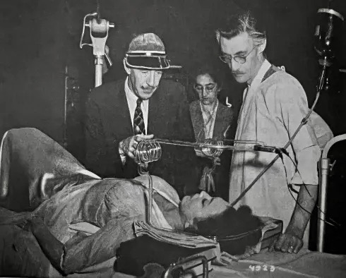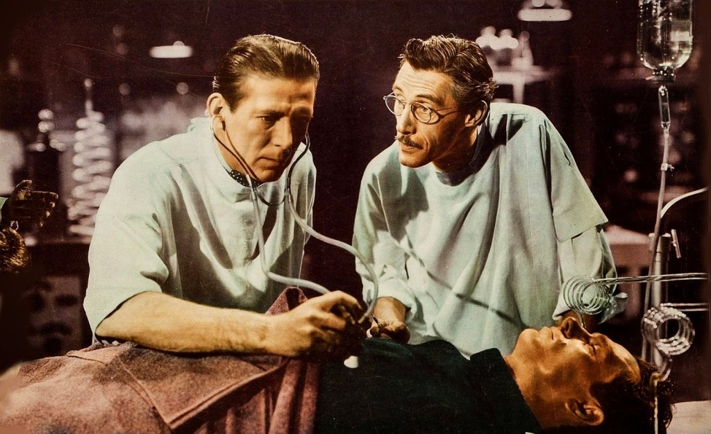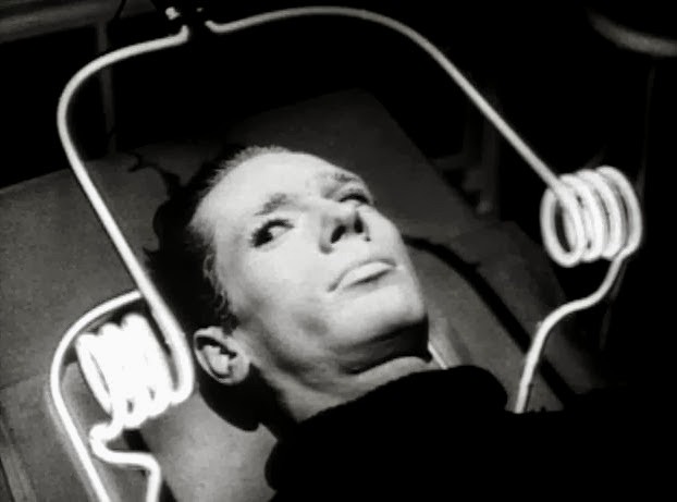 Unfolding with the illogical progression of a bad dream, The Face of Marble opens on a dark and stormy night as Professor Randolph (John Carradine) searches for a new guinea pig for his electro-chemical experiment, a procedure that has the potential to revive the recently deceased. Immediately you know he’s doomed to failure because mad scientists in horror films never succeed. But Dr. Randolph doesn’t know that and, along with fellow researcher Dr. David Cochran (Robert Shayne), tries to bring a drowned fisherman back to life, succeeding only in giving the cadaver a “face of marble” (a ghostly white makeup effect that Robert Blake must have copied for his character in David Lynch’s Lost Highway, 1997). Other guinea pigs follow including Brutus, the faithful family dog, who is transformed into a transparent being who starts preying on the local livestock.