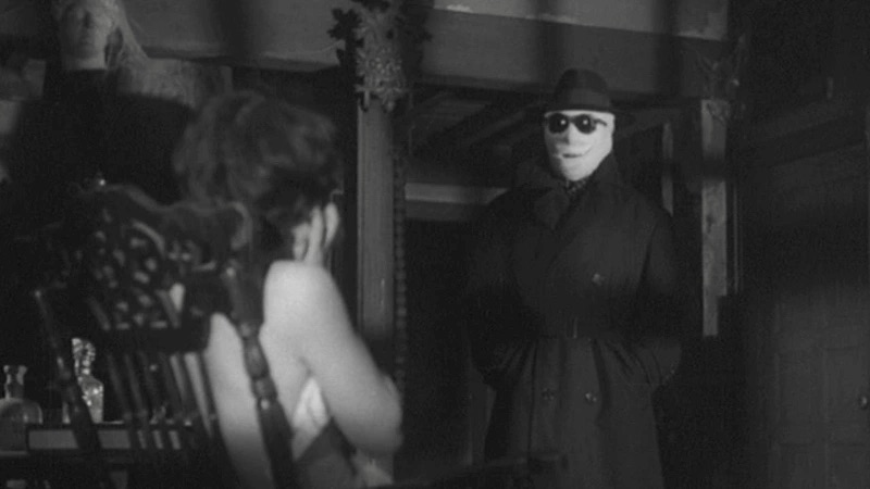 Tsumuna’s escape rates a front page headline in the newspaper and members of a mutual arts organization known as the Bizarro Enthusiast Club are busy discussing the case when a strange man with facial scars, rotten teeth and dark glasses enters their office requesting a model for his art needs. In case you’re wondering this so called arts club is little more than a front for female escorts who make their money posing nude for photographers or self proclaimed artists but even the club managers and their models are taken aback by this creepy looking stranger who claims he is referred by Dr. Kano, director of the mental asylum, and lists his name as Ghostman Sagawa. Despite their reservations, the model Keiko is sent to Sagawa’s home for a modeling session. She is given a drug by the man who came to her office but when he flees suddenly, she is confronted with a more disturbing visage – the real Sagawa, whose face is bandaged and looks like Claude Rains in The Invisible Man (1933).