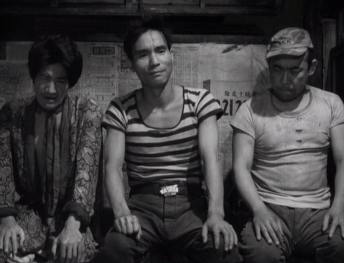 Dobu is an immersion into the lower depths of Japanese society in the post-war years and the people portrayed in the film have reached rock bottom, desperately trying to survive as best they can. Among the down and out residents are Toku and Pin, two unemployed factory workers who are roommates and spend most of their idle time gambling what little money they have at the horse races. They end up taking the homeless Tsuru into their home but the decision is not a matter of compassion. They see Tsuru as someone they can exploit for their own purposes and soon they manage to sell her off as a hostess to a saloon where the local slumlord and other moneyed clients are pampered with booze and available women.