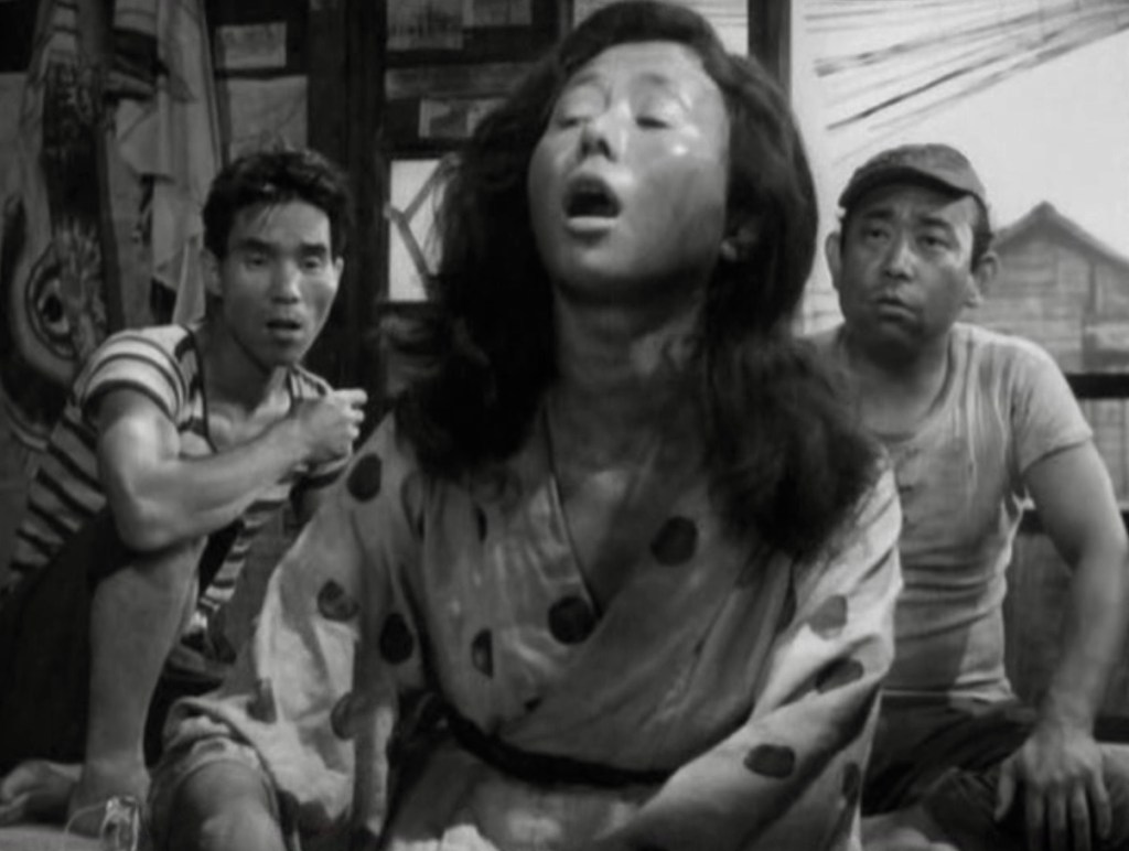 One of the most famous Japanese directors of his generation (1912-2012) to emerge from the post-WW2 years was Kaneto Shindo but, outside of a handful of films, most of his work remains largely unseen in the U.S. That is a shame because much of his filmography provides a fascinating glimpse into the lives and mindsets of Japanese people, especially the working class, in the difficult years following the country’s defeat in the war. One of his earliest and most provocative depictions is Dobu (1954), which is also known as The Ditch, but is more accurately translated as The Gutter. And the main protagonist of the film is Tsuru (Nobuko Otowa), who could easily claim to be the most memorable guttersnipe of all time. When the film opens, she is a filthy, wandering beggar on the verge of starvation who collapses in a shantytown known as Kappunuma and here she will remain for the rest of her brief life.