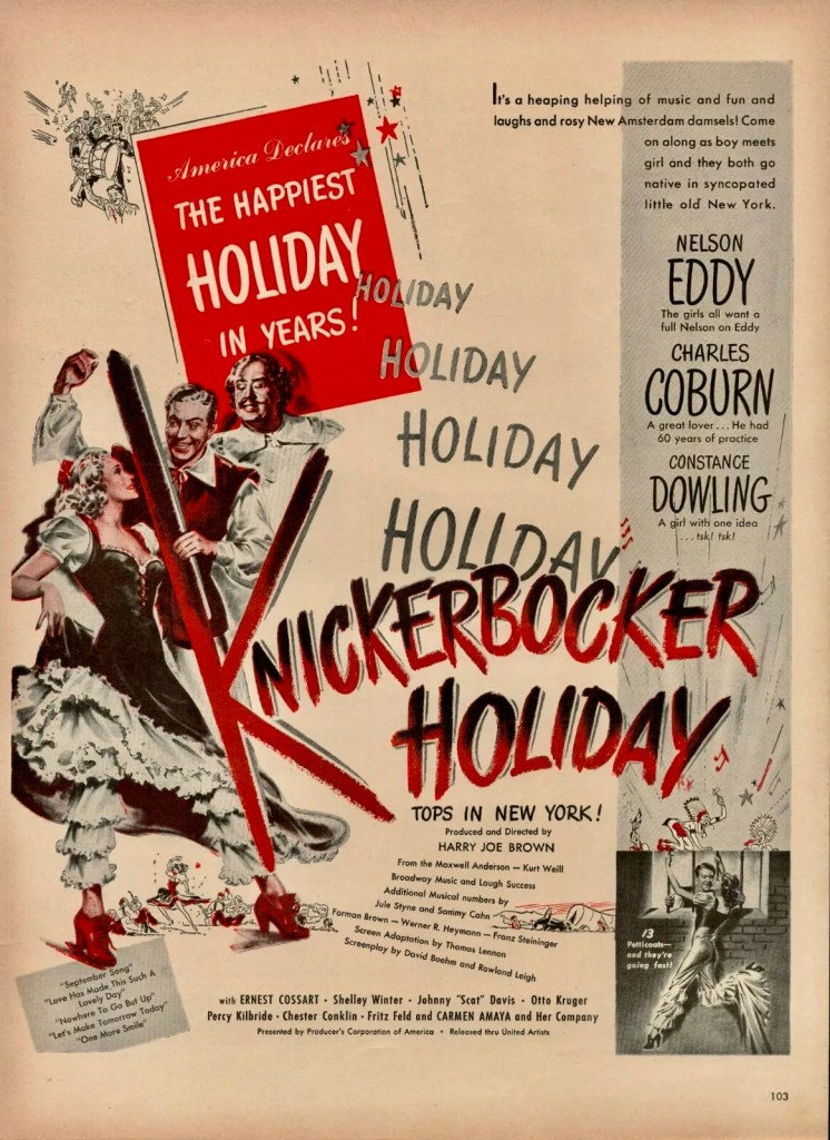 Shelley Winters has never been shy about expressing her opinions about her films, fellow actors or love affairs and, in her first autobiography, Shelley Also Known as Shirley, she recalled this rarely revived musical comedy set in New Amsterdam in 1650. Based on a popular play by Maxwell Anderson, Knickerbocker Holiday (1944) didn’t fare too well on the screen despite a talented cast including Nelson Eddy, Charles Coburn, Constance Dowling and Percy Kilbride. According to Winters, “We all sensed disaster from the third day. Charles Coburn was a fine actor, but he wasn’t Walter Huston [who was a sensation in the Broadway play]. Nelson Eddy had a beautiful voice, but he was self-conscious in this role and took on a Chocolate Soldier quality. Also, he didn’t want Connie [Dowling] to look into his eyes when they did a scene, insisting she look at his forehead instead. It really threw her.”