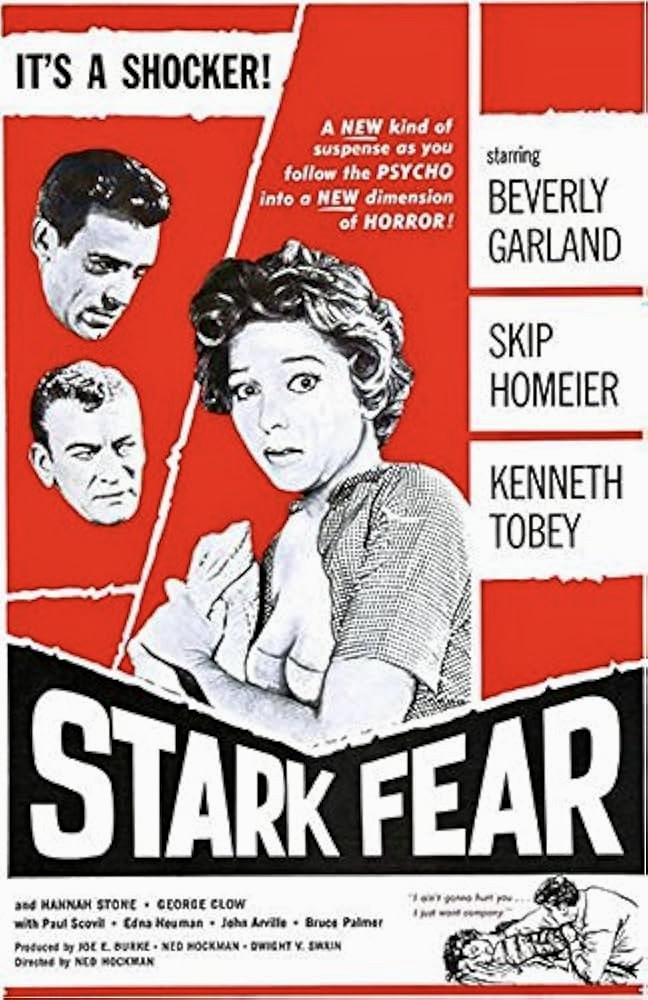 Stark Fear (1962) was not a Corman film and was even more low-budget than that director’s customary drive-in product. Stark Fear depicts the trials and tribulations of a woman (Garland) horribly abused by her violent, drunken husband and the sordid lowpoints include a rape in a cemetery. There is a grim fascination to this obscure indie that was promoted in the wake of Psycho as a shocker in the same vein but the shocker is that Garland agreed to do it. “That was made in Norman, Oklahoma, by Ned Hockman, the head of a drama department there,” Garland told Tom Weaver. “We kept saying to him, “This script doesn’t make any sense,” and he said, “No scripts at the Cannes Film Festival make sense, and they all win. This’ll be fine.”….It was a disaster…Skip Homeier finally ended up taking over the direction, and Skip didn’t know anything about making a movie, either! It just got to be more and more of a mess, but we finished it. I remember seeing it in a theatre here, and there were three people in the audience. The next day I came back to bring some more people, and the theater owner said he’d pulled it and was not going to show it any more. That was the worst movie that ever came out.”