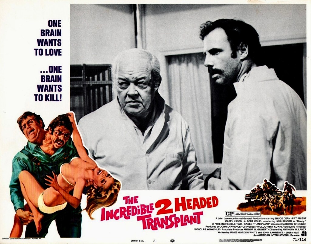 For some reason, there were TWO movies about two-headed transplants in 1971. The more famous of the two was The Thing with Two Heads starring Ray Milland as a wealthy white bigot who finds his head transplanted onto the body of a black Death Row prisoner (Rosie Greer). The lesser known title is The Incredible 2-Headed Transplant starring Bruce Dern as a mad scientist. Dern didn’t want to do the picture but his agent got him $3,500 for a ten day shoot so he signed on. Still, the actor had a hunch from the beginning that The Thing with Two Heads was going to steal their thunder, noting in his autobiography, Things I’ve Said But Probably Shouldn’t Have, “…Rosie Greer is a big person. It’s easy to mount two heads on him because he’s six feet nine and weighs 340 pounds. I had known him since college, when I was at Penn and he was at Penn State. He was national champion in the shot put and also was a great football player and was one of the fearsome foursome of the Rams. The year before he had been in the room when Robert Kennedy was shot, and he was the guy who physically picked up Sirhan Sirhan and slammed him against the bar. And Ray Milland is an Oscar winner. The audience is going to see their movie, not my little movie where I’m the doctor who creates this guy, a seven-foot kid who went to Southern Cal as a basketball player, who has a little actor strapped on his back. The big guy is the nice guy, and the little guy who’s the other head is the bad, sick guy. They run around creating all kinds of mayhem….Andrea [Beckett, Dern’s third wife] and I got married off the money from The Incredible 2-Headed Transplant. That was the end of my bona fide B days. That wasn’t a B. If you’ve going to call The Wild Angels a B movie, this was a Z movie.”