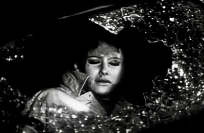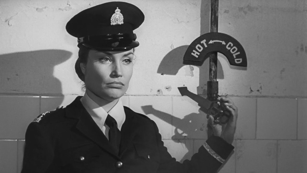 The nuttiness starts with a botched jewelry store robbery in which Bob Fishman (Erik Schumann) kills a policeman who tries to apprehend him. Crushing the cop with his car, Bob runs off, leaving his injured accomplice and girlfriend Betty Williams (Essy Persson) to take the rap. Over black and white still photographs of Betty being arrested and processed at a Glasgow prison for women, a raucous rock ‘n’ roll theme song entitled “Dirty Angels” reflects the rebellious, anti-social attitudes of the main protagonists (The film score is by prolific German composer Erwin Halletz, who specialized in genre efforts like Liane, Jungle Goddess [1956] and Treasure of the Incas [1965]).