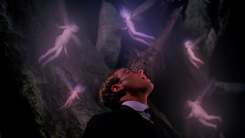 It isn’t until Charles eats some tiny white flowers growing on the tree (just as the two girls had done) that he goes into a hallucinatory state similar to ingesting magic mushrooms and see the fairies for himself. And unlike the fantastic spirits seen in FairyTale: A True Story, the sprites in Willing’s film are somewhat creepy, emerging out of Charles’s mouth in one scene and aggressively penetrating his body in another. The fairies are also mostly female and nude (making this inappropriate for children) with the exception of one rather obese, bald-headed male fairy displaying his male genitalia.