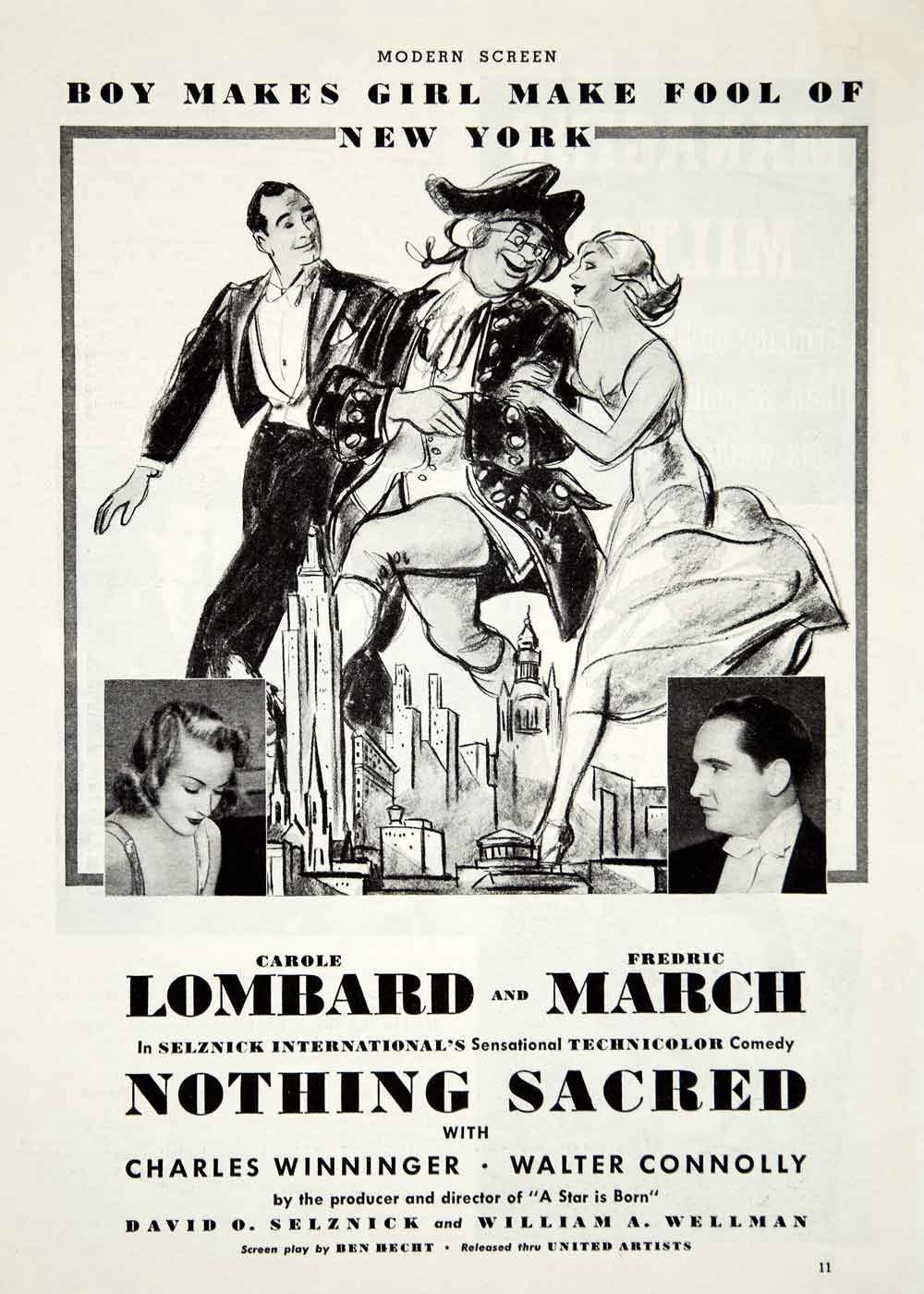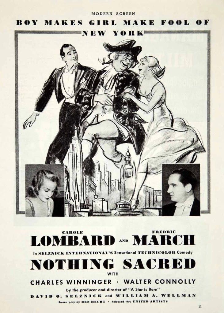 Nothing Sacred (1937) is a key film in that short-lived genre known as ‘the screwball comedy,” a unique Hollywood creation that flourished between 1933 and 1940. Distinguished by its eccentric characters, irreverent humor, and breakneck pacing, these films usually featured privileged but irresponsible characters running amok against the backdrop of the Great Depression when society was in turmoil. But while the idle rich were mercilessly lampooned in the most popular screwball comedy of the previous year – My Man Godfrey (1936) – the whole human race gets dished in Nothing Sacred, from the newspaper industry to a public that enjoys reading sob stories about someone else’s misfortune.