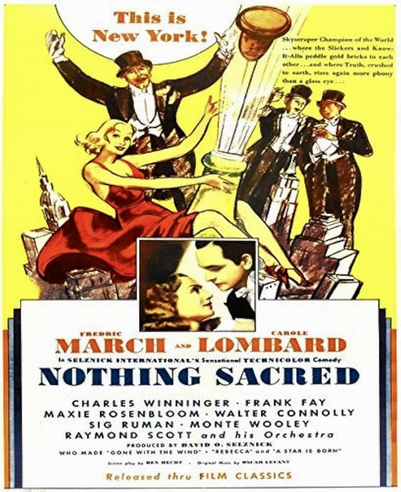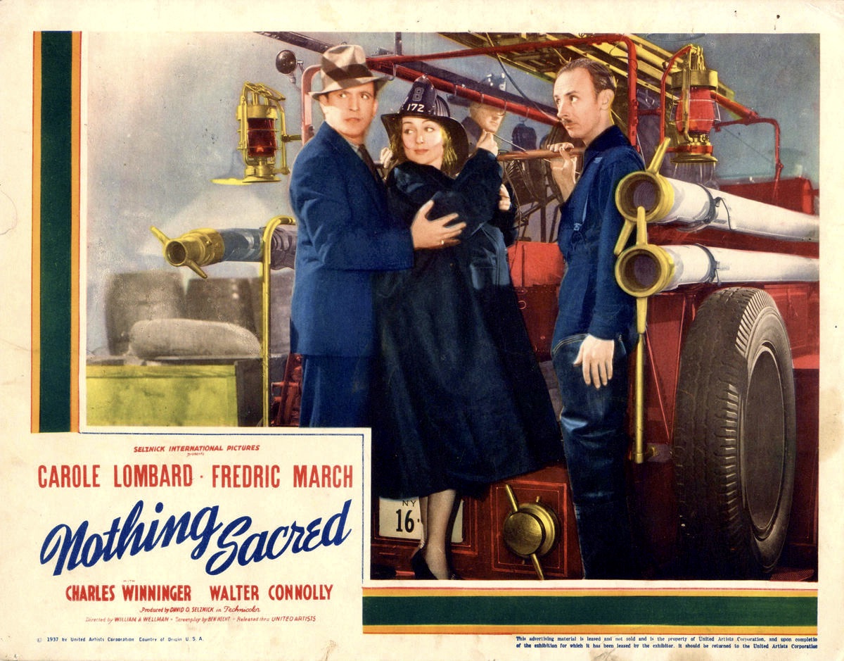 Ben Hecht, a former Chicago newspaper man working as a Hollywood screenwriter, was hired by producer David O. Selznick to come up with a comedy for Carole Lombard in the spring of 1937. After several false starts, Hecht finally heeded Selznick’s suggestion to adapt the short story, “Letter to the Editor” by James H. Street, that had appeared in Hearst’s International-Cosmopolitan. Hecht’s screenplay was titled Nothing Sacred and included a part for his friend, John Barrymore.