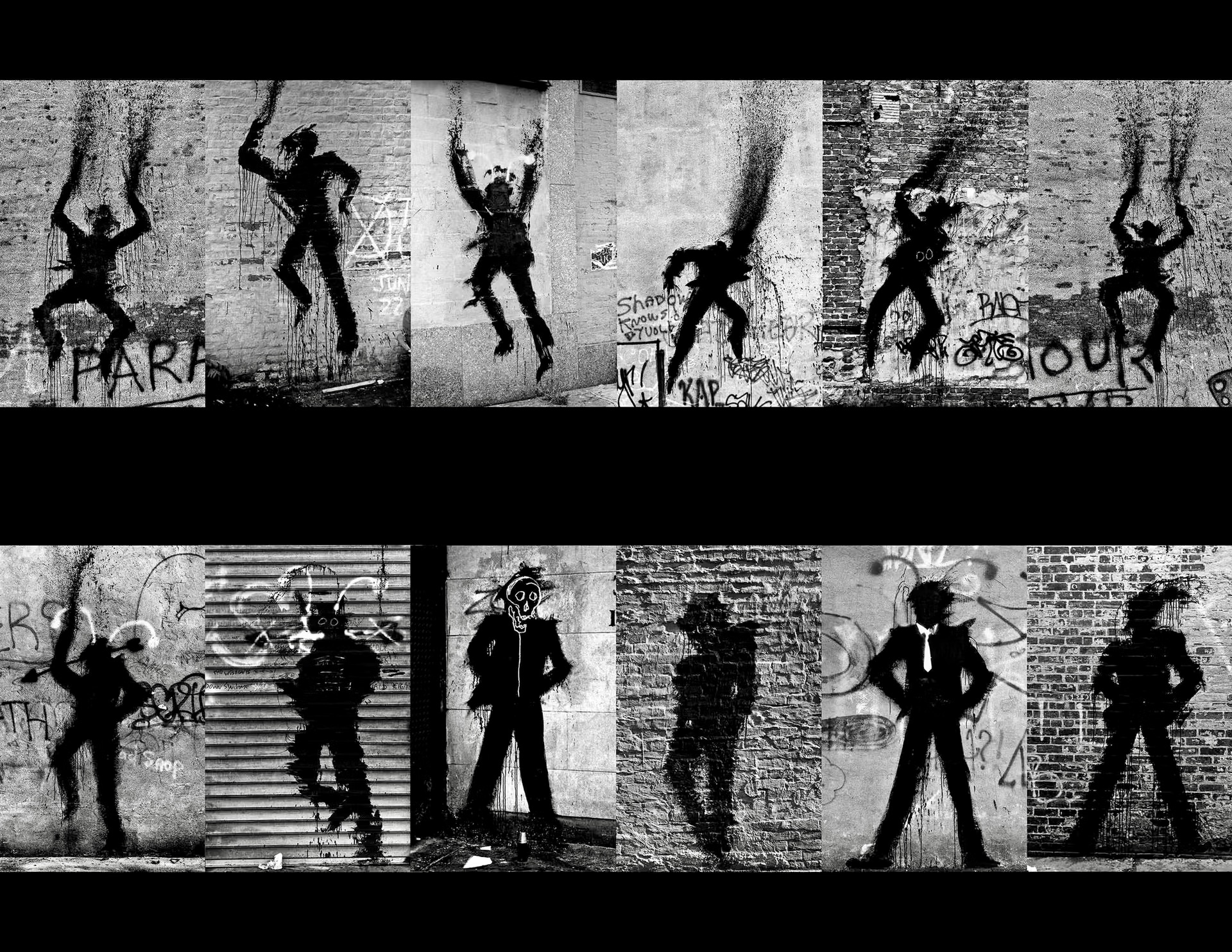 Hambleton followed this up with another multi-city tag campaign in 1980-81 known as I Only Have Eyes for You, for which he plastered street walls with hundreds of life-sized posters featuring himself as a stylish bon vivant with an unnerving, wide-eyed stare. But it was the Nightlife series he launched in NYC in 1982 that established his fame in the art world. Prowling the nocturnal streets of the Lower East Side, Hambleton would appropriate street corners, alleyways and other public wall spaces and, using black paint, create variations of a life-size silhouette that appeared to be watching the passing pedestrians.