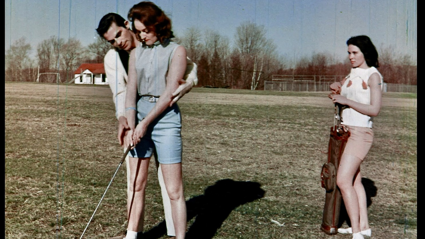 Joan (Tammy Latour aka Diane Vivienne, left) makes direct contact with golf pro Al Jordan (John Aristedes) for business purposes while his jealous married girlfriend (Gretchen Rudolph aka Jan Nash) looks on in MOONLIGHTING WIVES (1966).