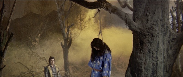 Based on stories by Goseki Kojima, the creator of the Lone Wolf and Cub series, Haunted Samurai unfolds like a classic samurai film from the early sixties except it is in color, the violence is more stylized and there are surprising touches which blur the line between a pulpy samurai actioner and an art film. Early in the movie we are treated to an almost surreal sequence in which Rokuheita is lured to an island by a seductive woman, only to be attacked by a band of topless female warriors. The battle begins on the shore and continues underwater where Rokuheita draws his sword and turns the water red with blood while fighting against his now completely nude antagonists. It is just one of the many astonishing and visually dazzling scenes in Ozawa’s epic.