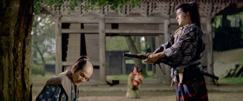What is particularly satisfying about Ozawa’s film is how well it balances an engrossing character study with enough kinetic action sequences to satisfy any chanbara fan. After an elegant opening credit sequence of Japanese watercolors accompanied by flute and percussion music (the score is by composer Hajime Kaburagi), we are introduced to Rokuheita, who has been ordered to kill Gamba (Eiji Go) for deserting his clan. A duel between the two men in a meadow ends with Gamba’s death, despite an attempt by Rokuheita’s sister to stop the fight. In protest over the clan’s code of punishing deserters, she commits suicide but Rokuheita has little time to grieve. His master Yojura of the Yagyu order has ordered him to kill another clan deserter, Ushizo (Yuji Odaka), who has abandoned his warrior ways and is now living quietly with his wife and child in a remote village.