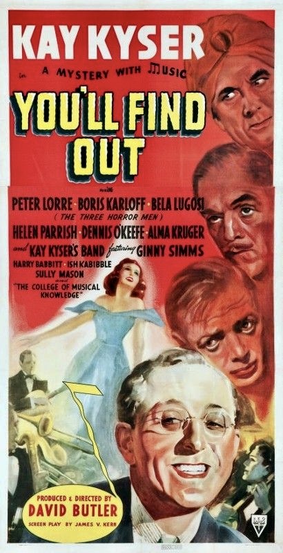 It’s hard to imagine what moviegoers today would make of Kay Kyser and his Kollege of Musical Knowledge, but during the late thirties and early forties the big band conductor was one of the most popular entertainers in America. Thanks to the medium of radio (which was at the height of its popularity during the WWII era), Kyser built up a huge fan base through his novelty act, a winning combination of music, humor and “kollege brainbuster questions” with a cash prize for the winner. Sporting wire-rim glasses, mortarboard and academic gown, Kyser created an eccentric bookworm persona for himself and surrounded himself with equally outlandish “colleagues,” one of the more famous being Ish Kabibble (the alter ego of musician M.A. Bogue). It was only a matter of time before Kyser took his act to Hollywood and, in 1939, RKO produced his first film, That’s Right, You’re Wrong. Its success led to a more ambitious second feature, You’ll Find Out (1940), which paired the bandleader with the triple threat team of Boris Karloff, Bela Lugosi and Peter Lorre.
