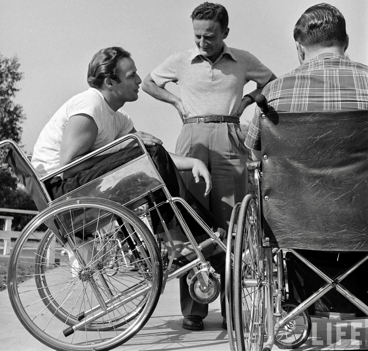 During the making of The Men, Brando was with some of the disabled veterans in the cast at the Pump Room when a religious woman spotted their group and began preaching to them. She stated that if they truly believed in the Lord, they could overcome their paralysis and walk again. Brando stared intently at the woman and said, “I believe you. I believe in the Lord,” and started to rise up slowly out of his wheelchair. According to Stefan Kanfer in his biography, Somebody: The Reckless Life and Remarkable Career of Marlon Brando, the actor “kept rising until he stood erect. Step by ungainly step he made his way to the bar. Then, without warning, he suddenly broke into an improvisatory dance, complete with leaps and jetes. The woman shrieked and fled as laughter filled the Pump Room. The loudest roars came from the wheelchair table.”