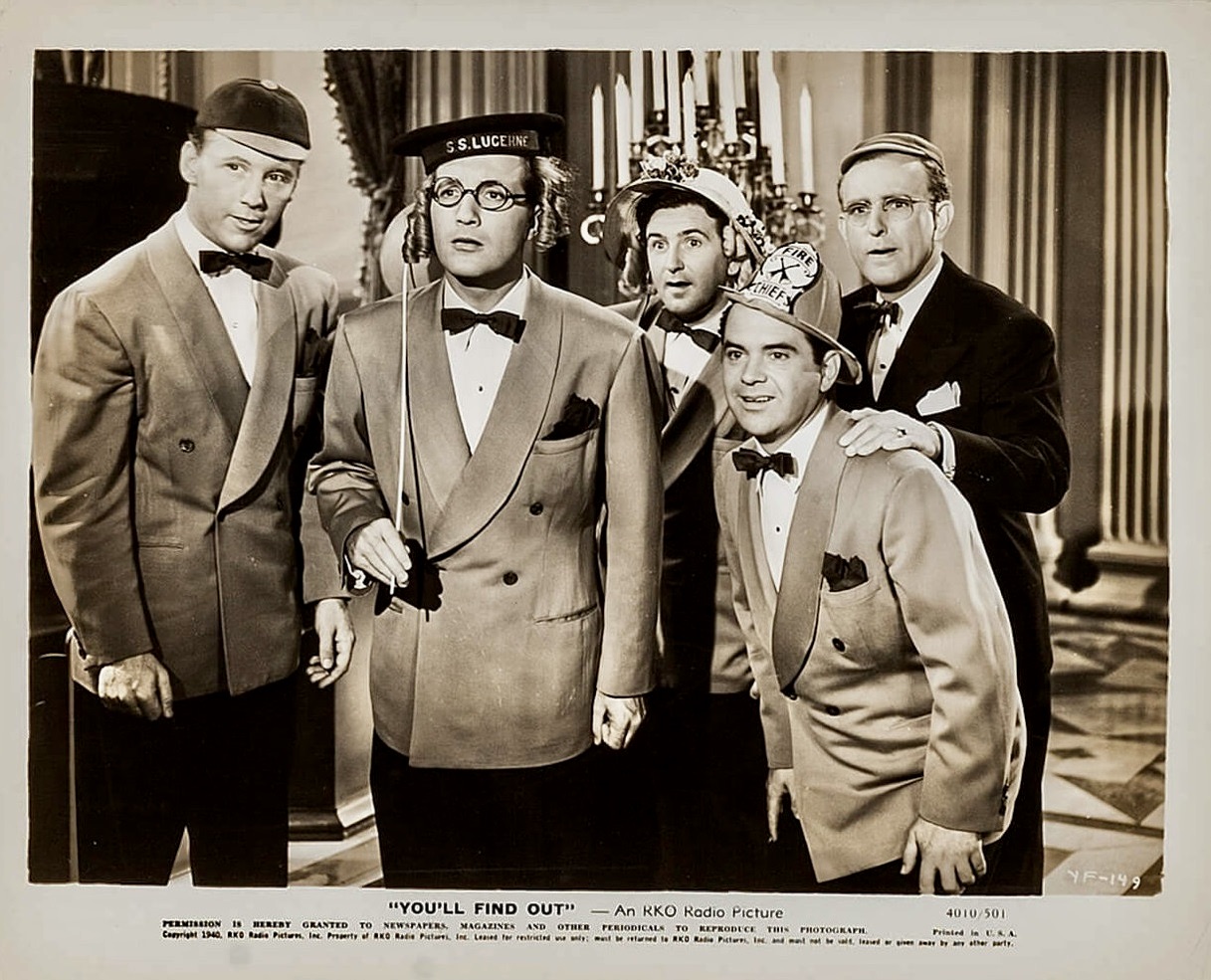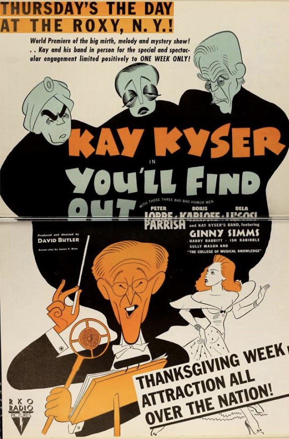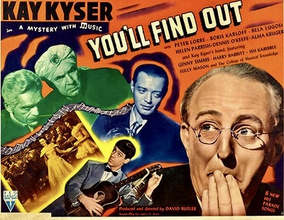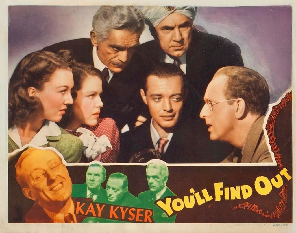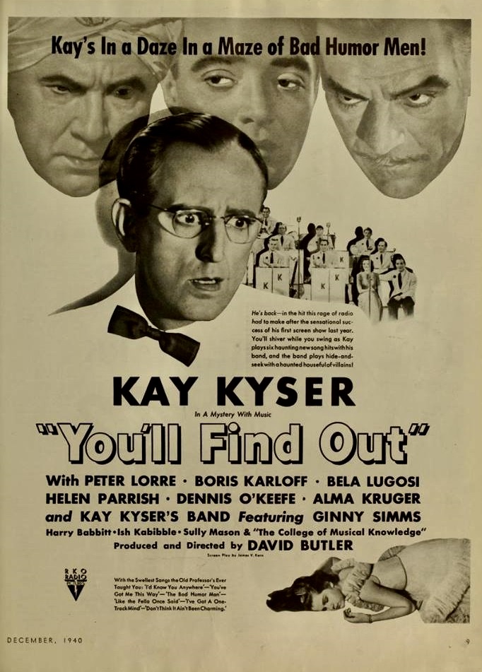 It’s hard to imagine what moviegoers today would make of Kay Kyser and his Kollege of Musical Knowledge, but during the late thirties and early forties the big band conductor was one of the most popular entertainers in America. Thanks to the medium of radio (which was at the height of its popularity during the WWII era), Kyser built up a huge fan base through his novelty act, a winning combination of music, humor and “kollege brainbuster questions” with a cash prize for the winner. Sporting wire-rim glasses, mortarboard and academic gown, Kyser created an eccentric bookworm persona for himself and surrounded himself with equally outlandish “colleagues,” one of the more famous being Ish Kabibble (the alter ego of musician M.A. Bogue). It was only a matter of time before Kyser took his act to Hollywood and, in 1939, RKO produced his first film, That’s Right, You’re Wrong. Its success led to a more ambitious second feature, You’ll Find Out (1940), which paired the bandleader with the triple threat team of Boris Karloff, Bela Lugosi and Peter Lorre.