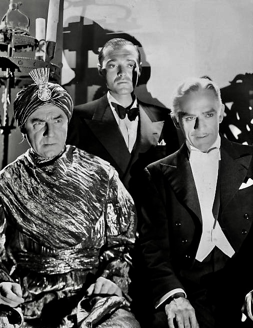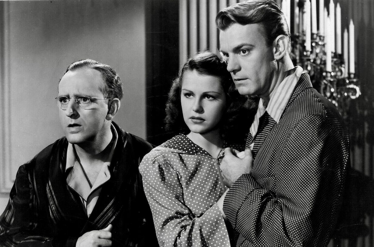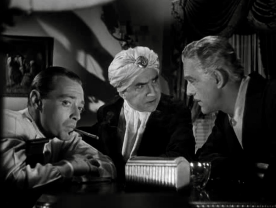 In You’ll Find Out, Kyser and company find themselves menaced by Karloff, Lugosi and Lorre when they agree to perform at the 21st birthday party of heiress Janis Bellacrest (Helen Parrish) at spooky old Bellacrest Manor. Karloff, who plays Judge Mainwaring, the family lawyer, enlists Prince Saliano (Bela Lugosi), a phony psychic, and Professor Fenninger (Peter Lorre), a so-called expert on supernatural phenomenon, as accomplices in his plot to kill Janis and take control of her inheritance. Interspersed amidst the skullduggery are the requisite musical numbers such as Harry Babbitt singing “You’ve Got Me This Way,” “I’d Know You Anyway” (featuring vocalist Ginny Simms) and “The Bad-Humor Man,” an over-the-top novelty song spotlighting Ish Kabibble; originally, this number was conceived as a musical trio act for Karloff, Lugosi and Lorre with the title, “We’re the Bad-Humored Man,” but was dropped. A pity.