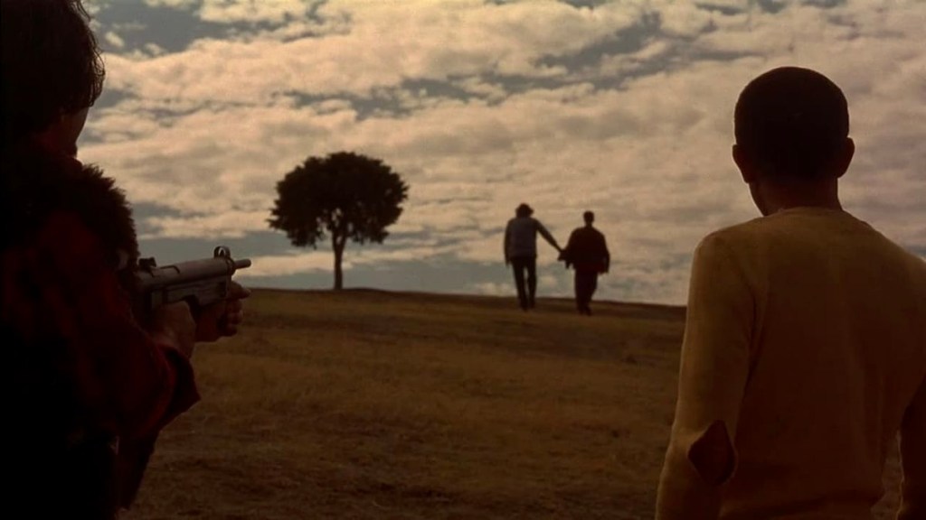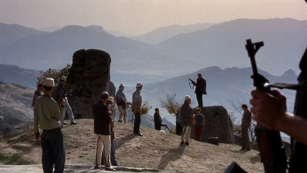 At times Before the Rain even feels like an American western transplanted to Macedonia in the way it depicts the vengeful Christians of Aleksander’s village as if they were a posse of vigilantes. The often stunning landscapes of rural Macedonia could easily be a western location with their rocky, mountainous terrain and dusty trails. And, in one scene, Aleksander even appears on a bicycle whistling “Raindrops Keep Falling on My Head” from George Roy Hill’s Butch Cassidy and the Sundance Kid(1969). There is even a homage to director Sam Peckinpah in an early scene where we see malicious children torture a turtle in a circle of fire, similar to the opening credits of The Wild Bunch (1969) where gleeful kids decimate scorpions in a fiery circle.